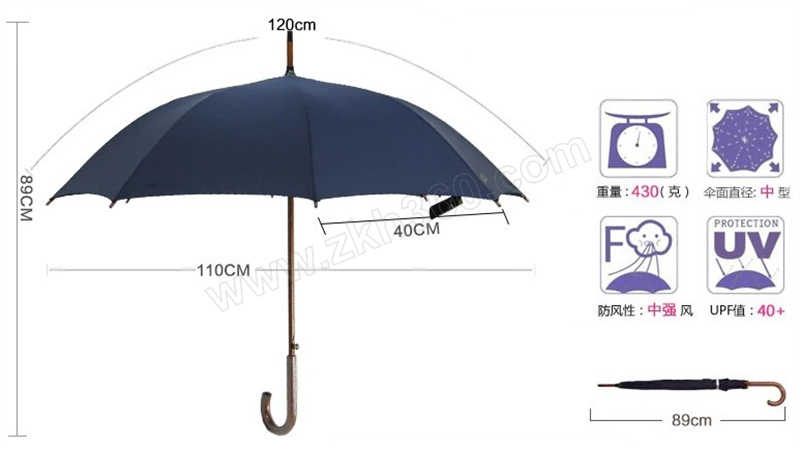 ·布料:碰击布 ·伞骨:烤漆8骨 ·中杆:木头伞杆 ·伞下直径:110cm ·伞高:89cm