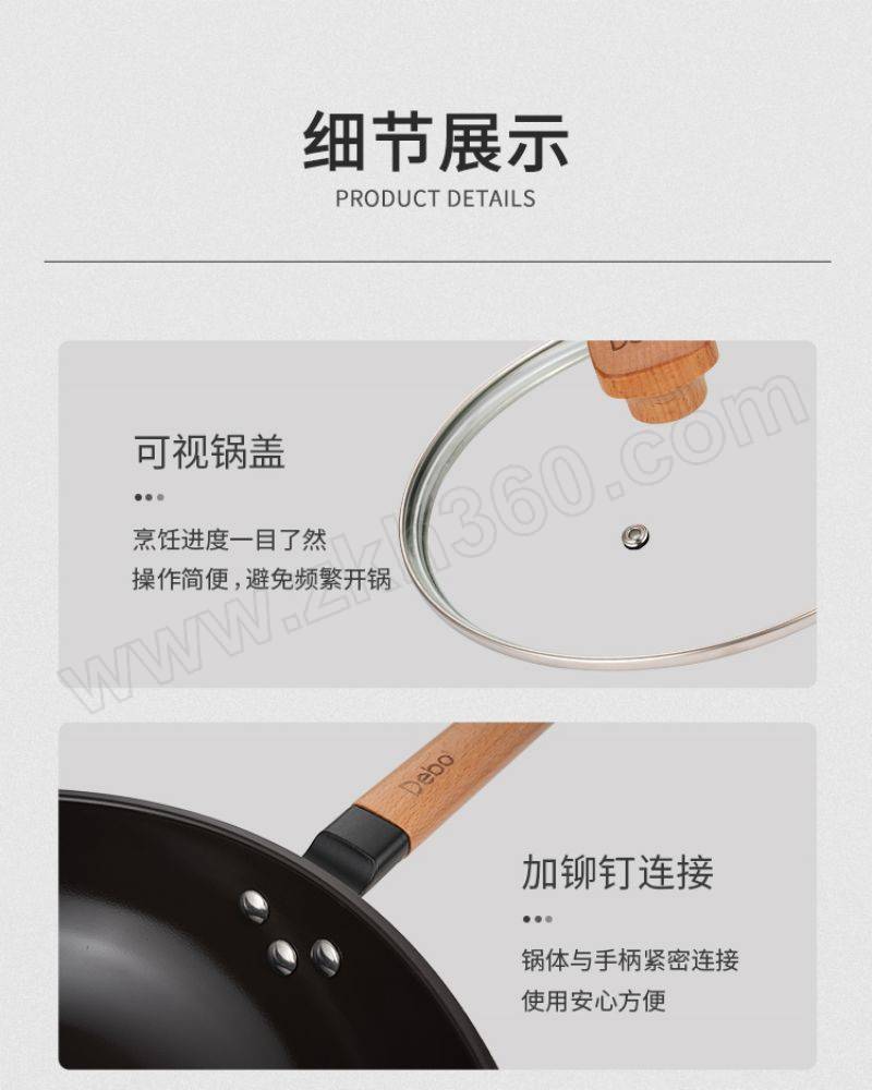 · 清爽颜值不油腻,下厨不油头; · 可视化烹饪,轻松简单,新鲜美味看得见; · 舒适木质手柄,质感细腻,隔热防烫; · 三件套配置,满足所有家庭基本所需, · 煎炒煮炸一应俱全。