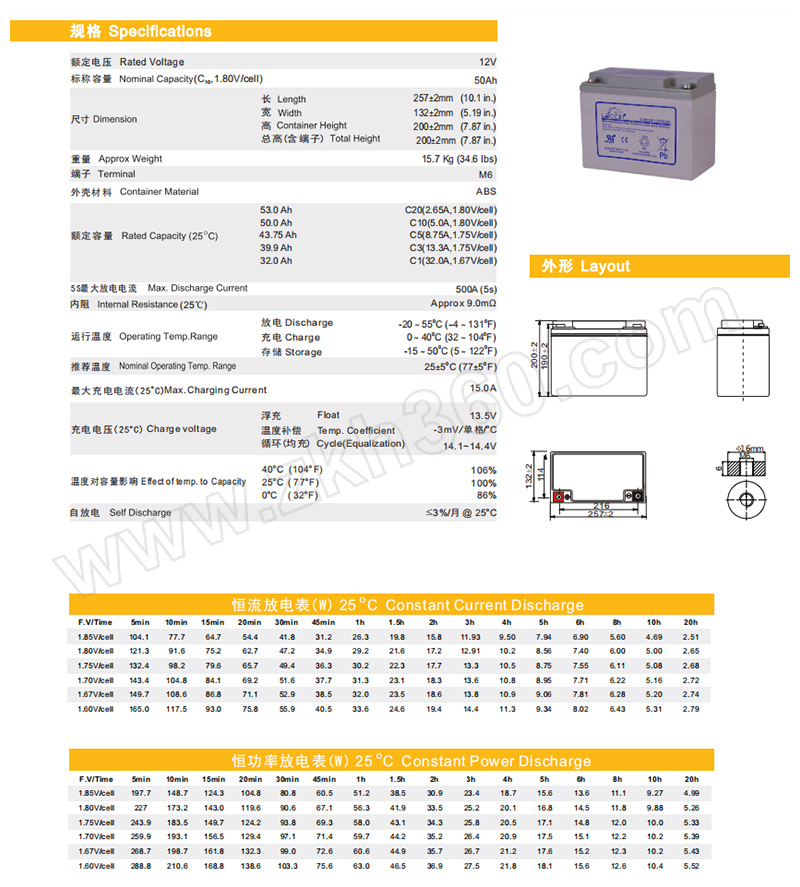 | 核心规格 | 12V 50Ah 257×132×200mm |