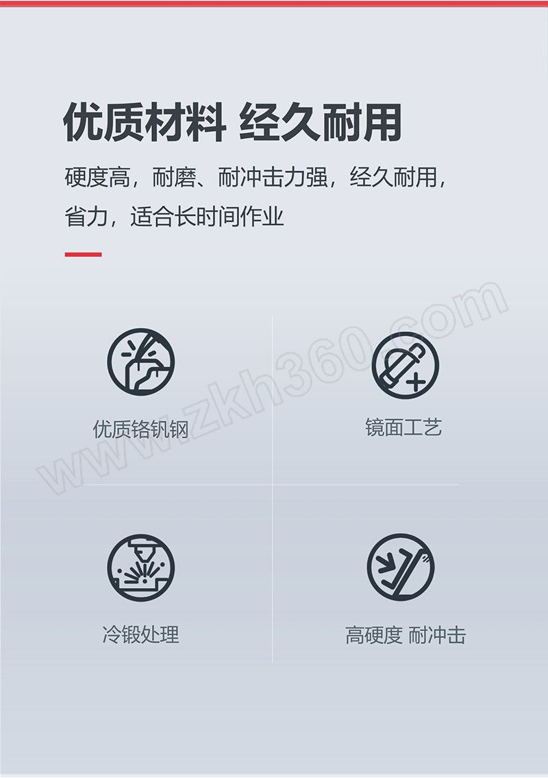 ·材质Cr-V,表面镜抛处理。 ·加厚内壁,不易变形,耐磨性好,经久耐用。 ·冷锻制作,整体淬火处理,耐冲击力强,硬度较高。