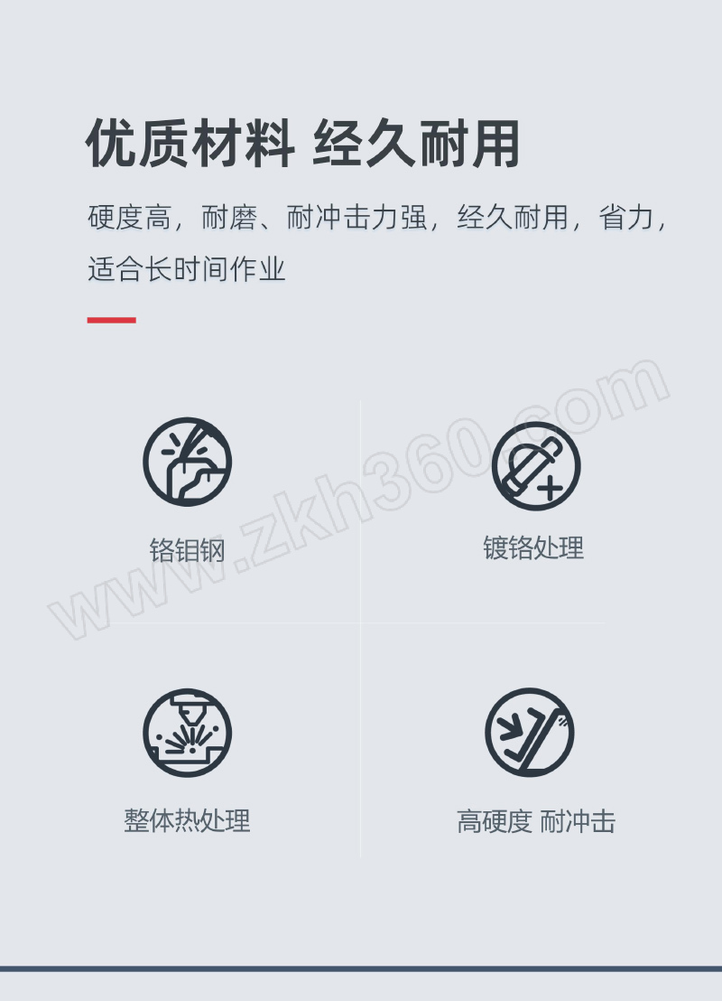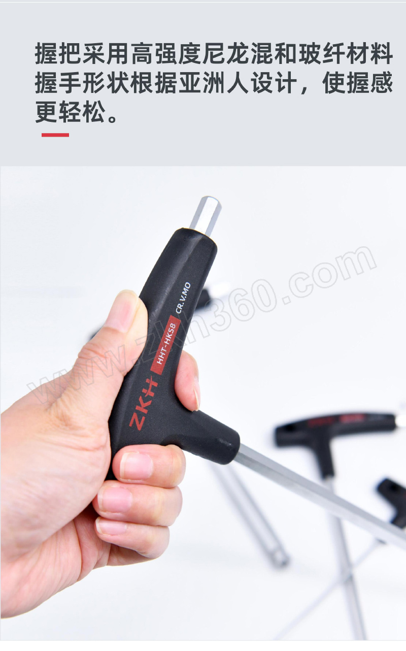 ·表面镜面镀铬处理,防锈效果更佳。 ·握把采用高强度尼龙混和玻纤材料。 ·握手形状符合人体工学,握起更轻松。