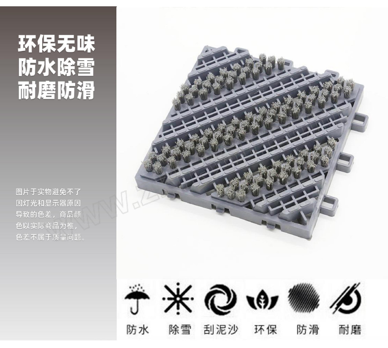 材质:EVA 加密草尖设计,PP材质毛刷,三合一斜边斜角结构设计,结构牢固,不易松动,排水通畅,坚固耐磨,防滑效果佳, (因测量手法产品挤压等因素,测量可能存在误差,以实际货物为准);