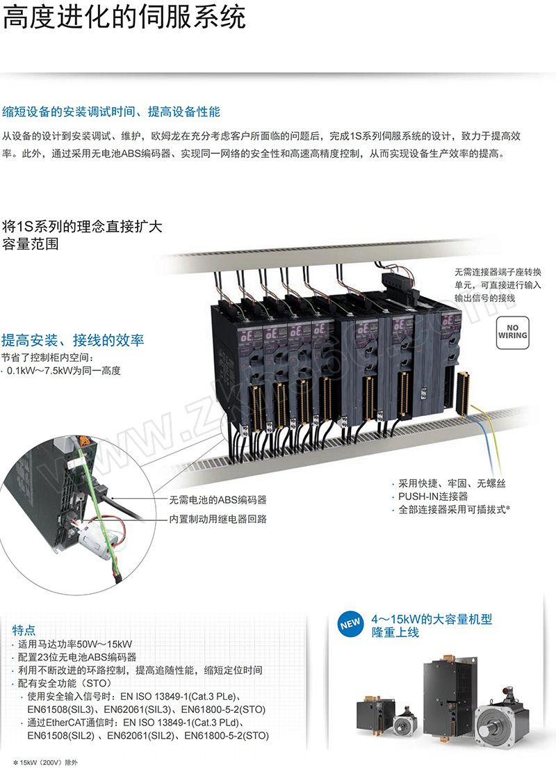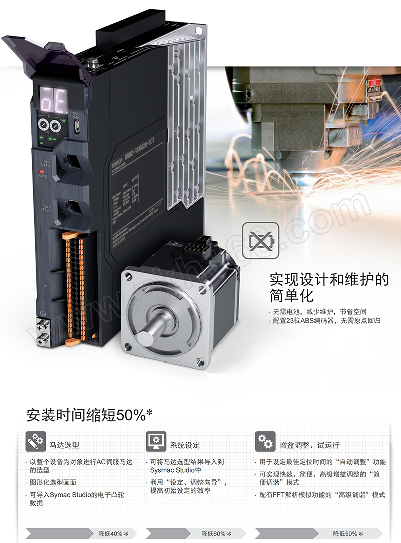 ·缩短设备的安装调试时间、提高设备性能 ·提高安装、接线的效率 ·无需电池,减少维护,节省空间 ·配置23位ABS编码器,无需原点回归( 采用ABS 电机时)