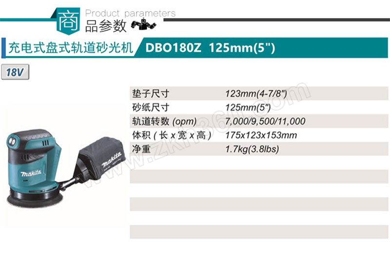 ·牧田 18V锂电盘式轨道砂光机 DBO180Z (裸机)