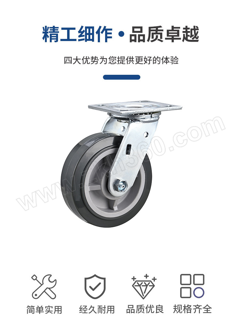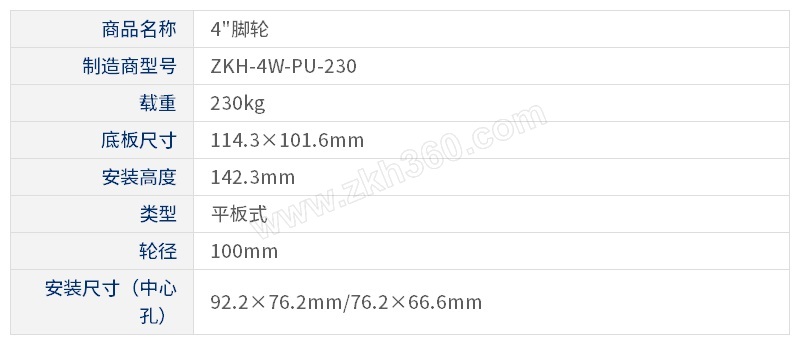 | 核心规格 | 轮径100mm 轮宽50mm 安装高度142.3mm 底板尺寸114.3×101.6mm |