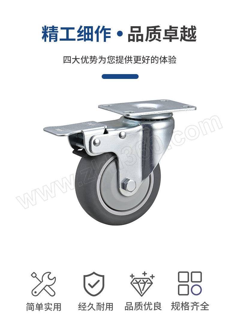 | 产品名称 | 4" 静音TPR 载重100kg 万向刹车 轻型脚轮 |