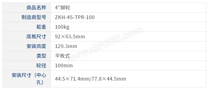 | 核心规格 | 轮径100mm 轮宽32mm 安装高度129.3mm 底板尺寸92×63.5mm |