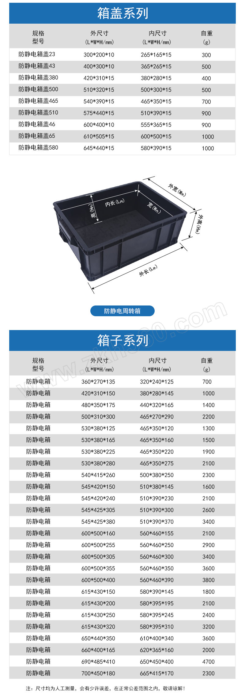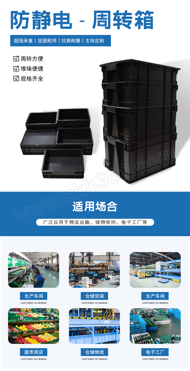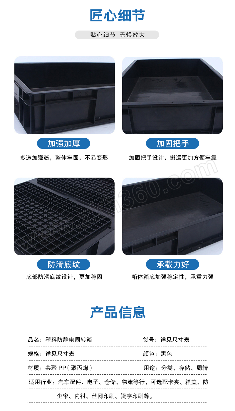 ·加厚底部耐磨耐用,标签夹设计轻松分类,叠放稳固,可配箱盖,圆角处理 ·配合条码和RFID等信息化使用方式 ·防静电周转箱均采用PP塑料为基材,加入静电复合材料注塑而成 ·表面电阻率10的5到8次方,小表 ·可另配防尘箱盖 ·可另配标签卡夹 ·可上下堆垛 ·承重力强、经久耐用、堆叠倒放,倾斜不倒、箱体加强筋设计