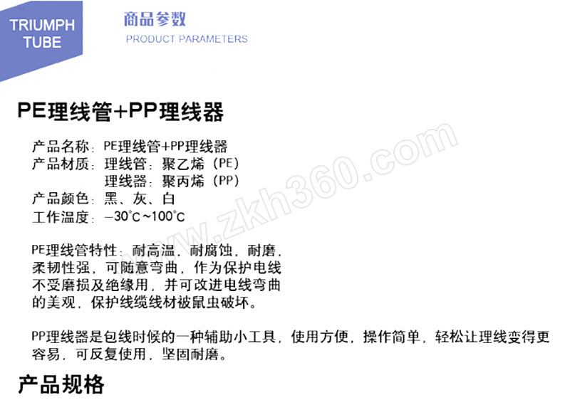 ·PE理线管特性:耐高温,耐腐蚀,耐磨,柔韧性强,可随意弯曲,作为保护电线不受磨损及绝缘用,并可改进电线弯曲的美观,保护线缆线材被鼠虫破坏。PE理线管特性:耐高温,耐腐蚀,耐磨,柔韧性强,可随意弯曲,作为保护电线不受磨损及绝缘用,并可改进电线弯曲的美观,保护线缆线材被鼠虫破坏。PP理线器是包线时候的一种辅助小工具,使用方便,操作简单,轻松让理线变得更容易,可反复使用,坚固耐磨。