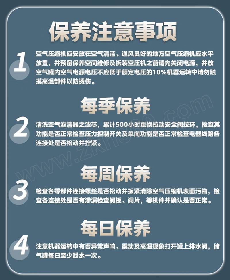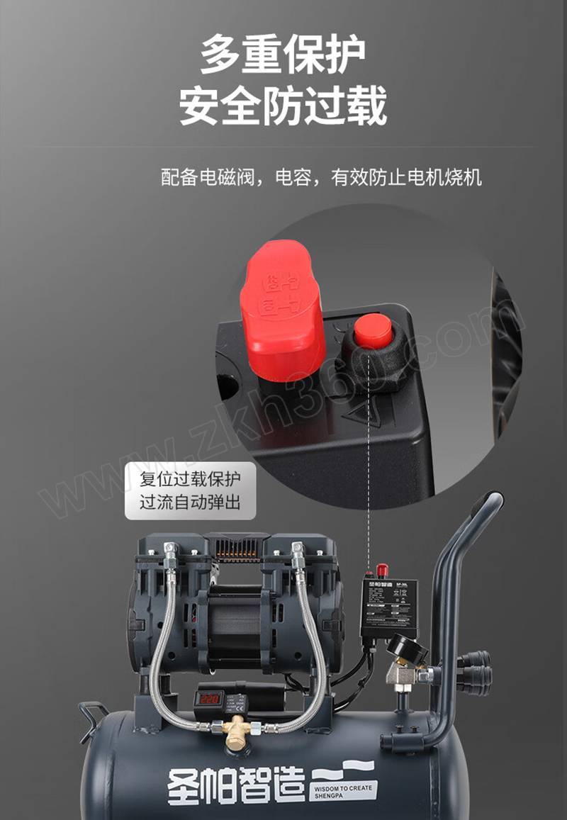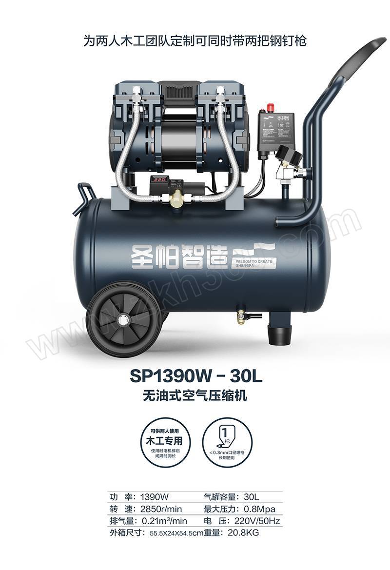 ·功率:1390W ·气罐容量:30L ·转速:2850r/min ·最大压力:0.8Mpa ·排气量:0.21m³/min ·电压:220V/50Hz ·外箱尺寸:55.5X24X54.5cm ·重量:20.8KG