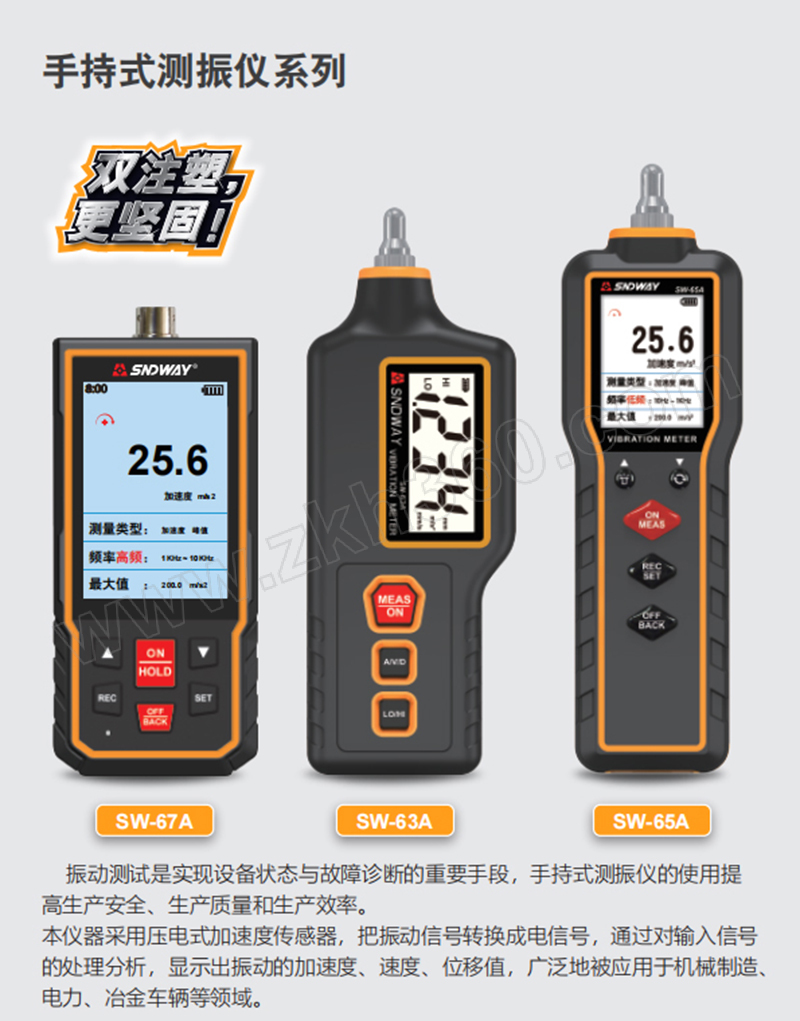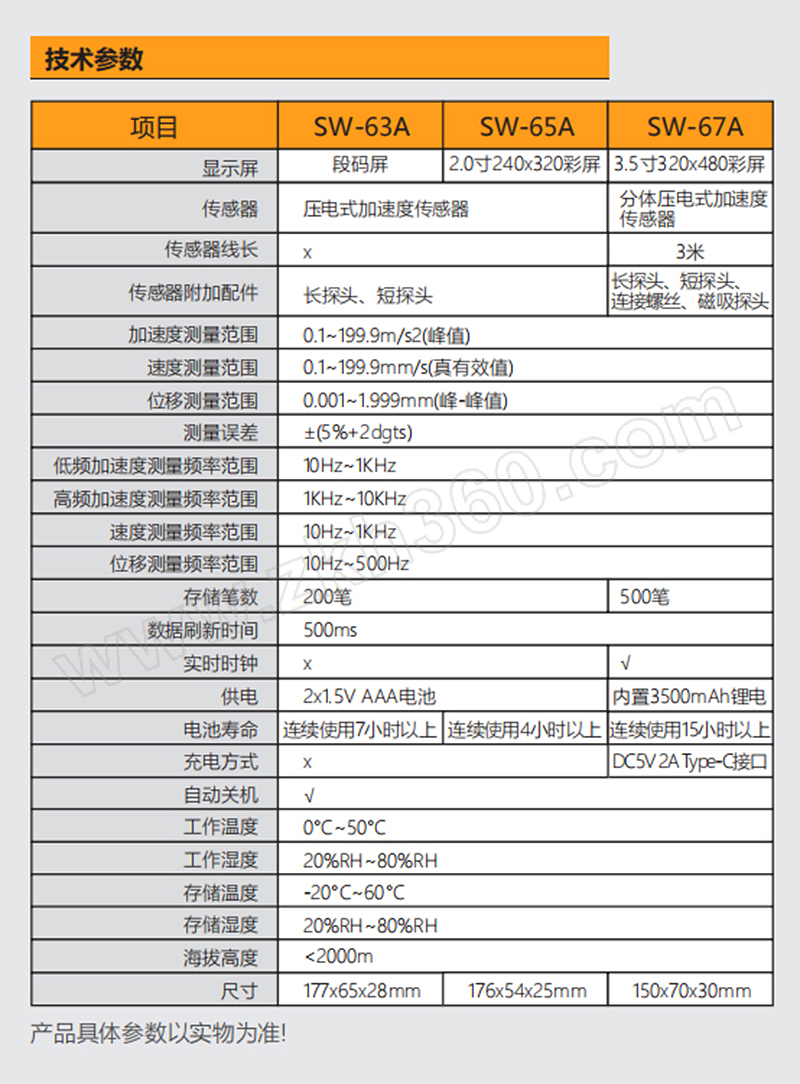 ·双色模工艺外壳 ·支持测量加速度低频、加速度高频、速度、位移 ·0.5s刷新数据 ·2节AAA电池供电