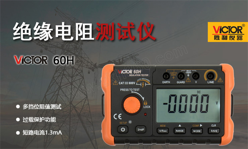 ·VICTOR60H绝缘电阻测试仪是一台智能微型绝缘测试仪器,可以完成绝缘电阻、电压等参数测量,性能稳定,操作简便