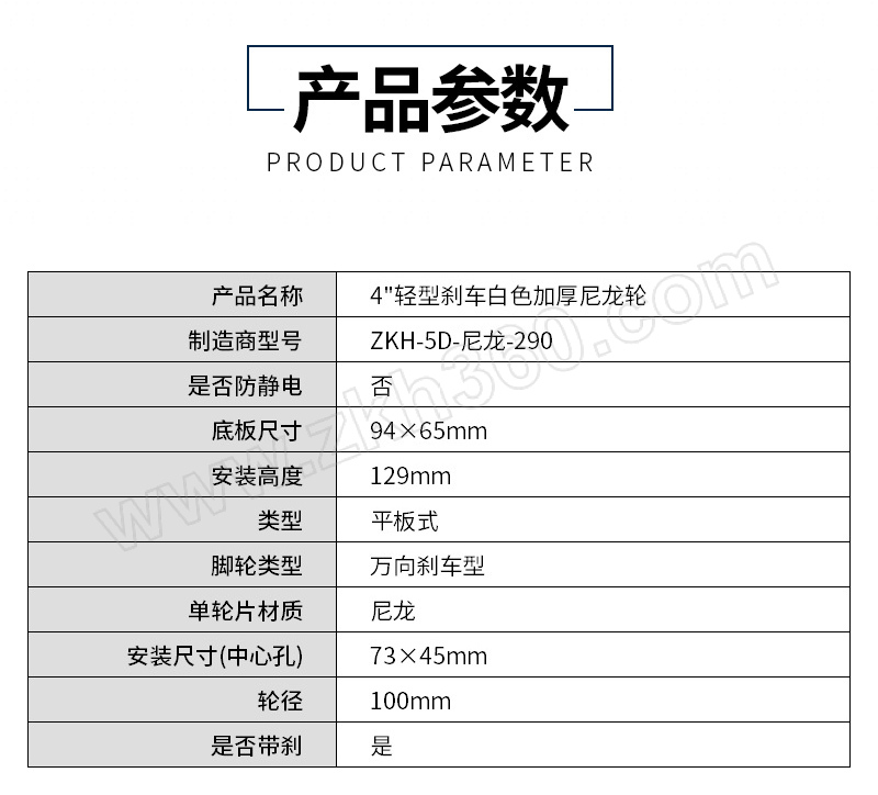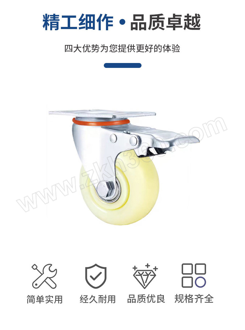 | 产品名称 | 4" 白色加厚尼龙 载重80kg 万向刹车 轻型脚轮 |