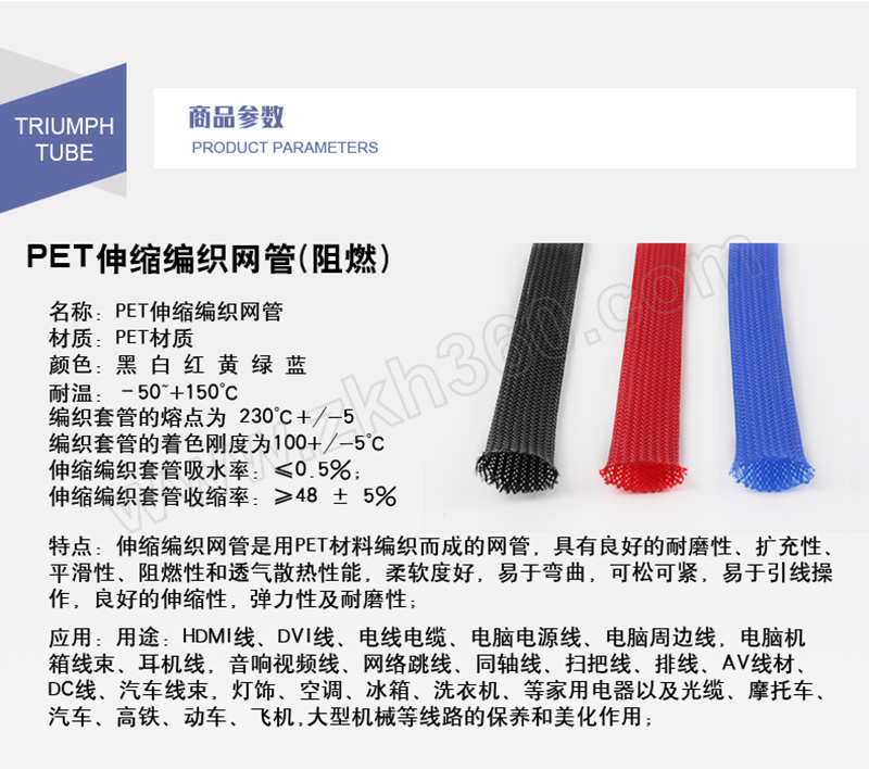 ·符合ROHS2.0环保标准,耐温150℃,普通阻燃。 ·伸缩编织网管是用环保PET材料编织而成的网管,具有良好的耐磨性、扩充性、平滑性、阻燃性和透气散热性能,柔软度好,易于弯曲,可松可紧,易于引线操作,良好的伸缩性,弹力性及耐磨性;