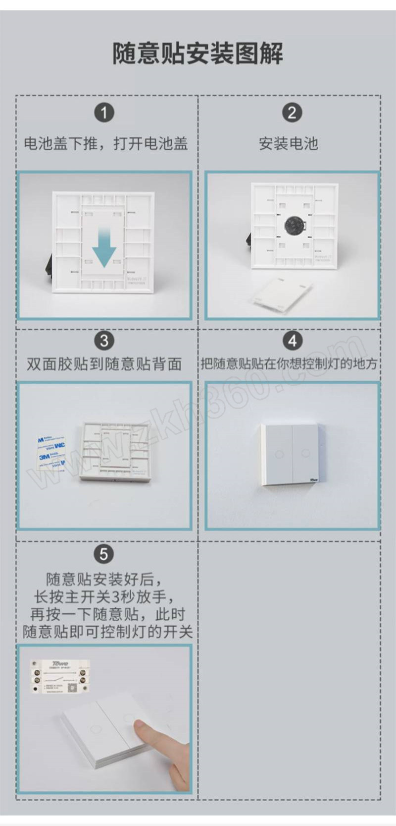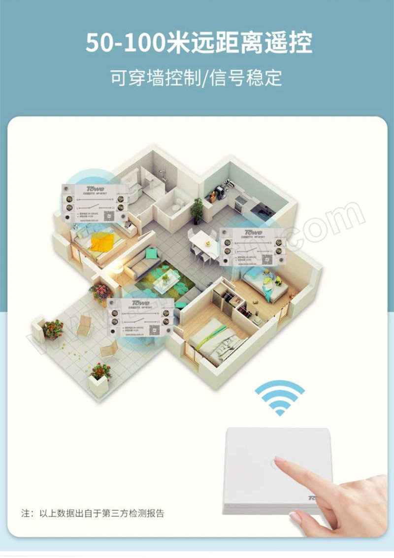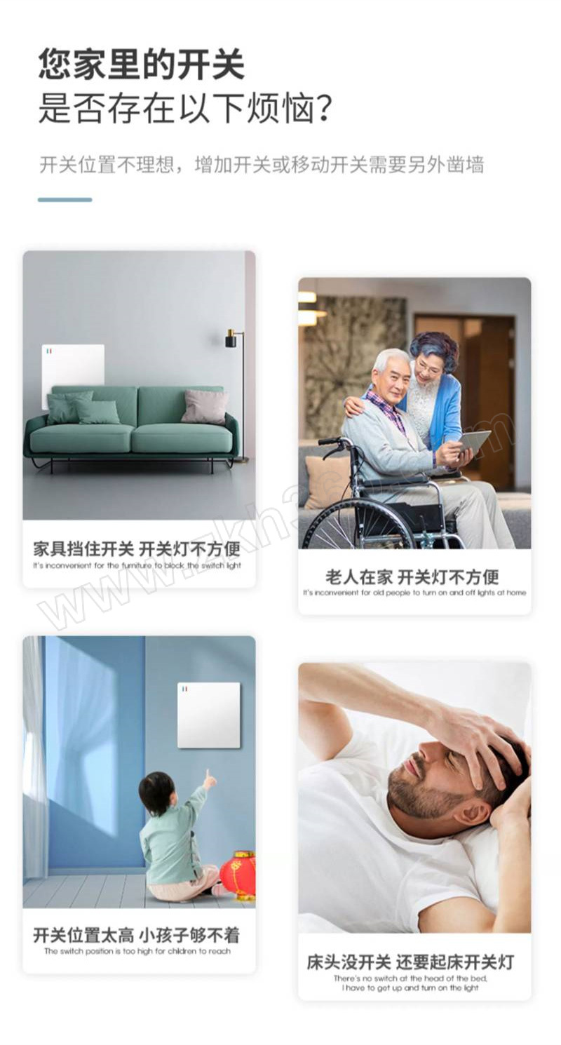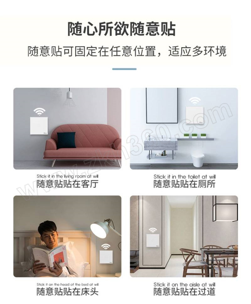 | 核心规格 | 智能无线家用遥控随意贴,两路带遥控开关,遥控距离50-100米 |