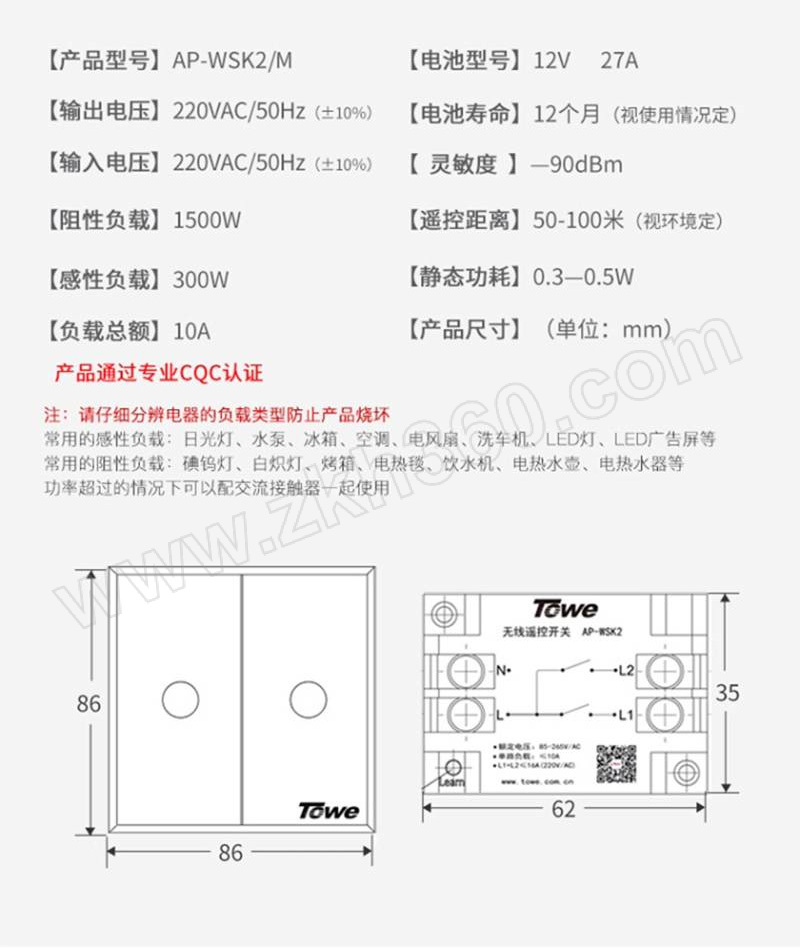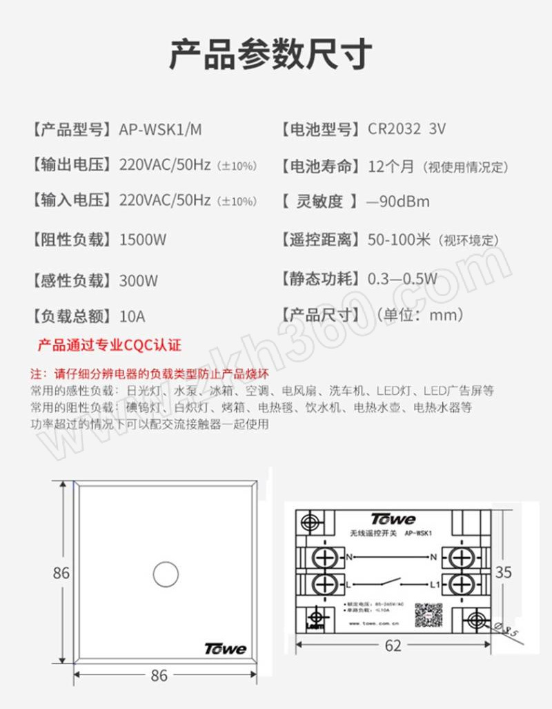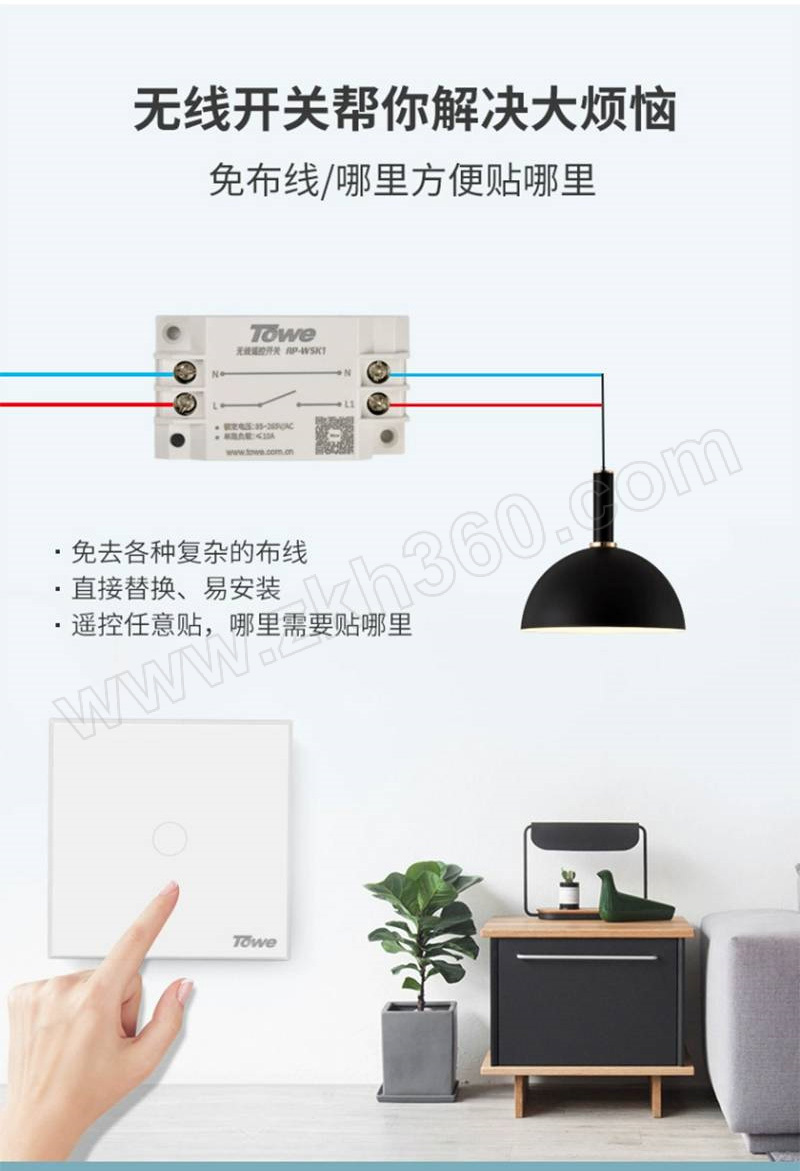 | 产品名称 | TOWE同为无线单双控开关免布线遥控开关 |