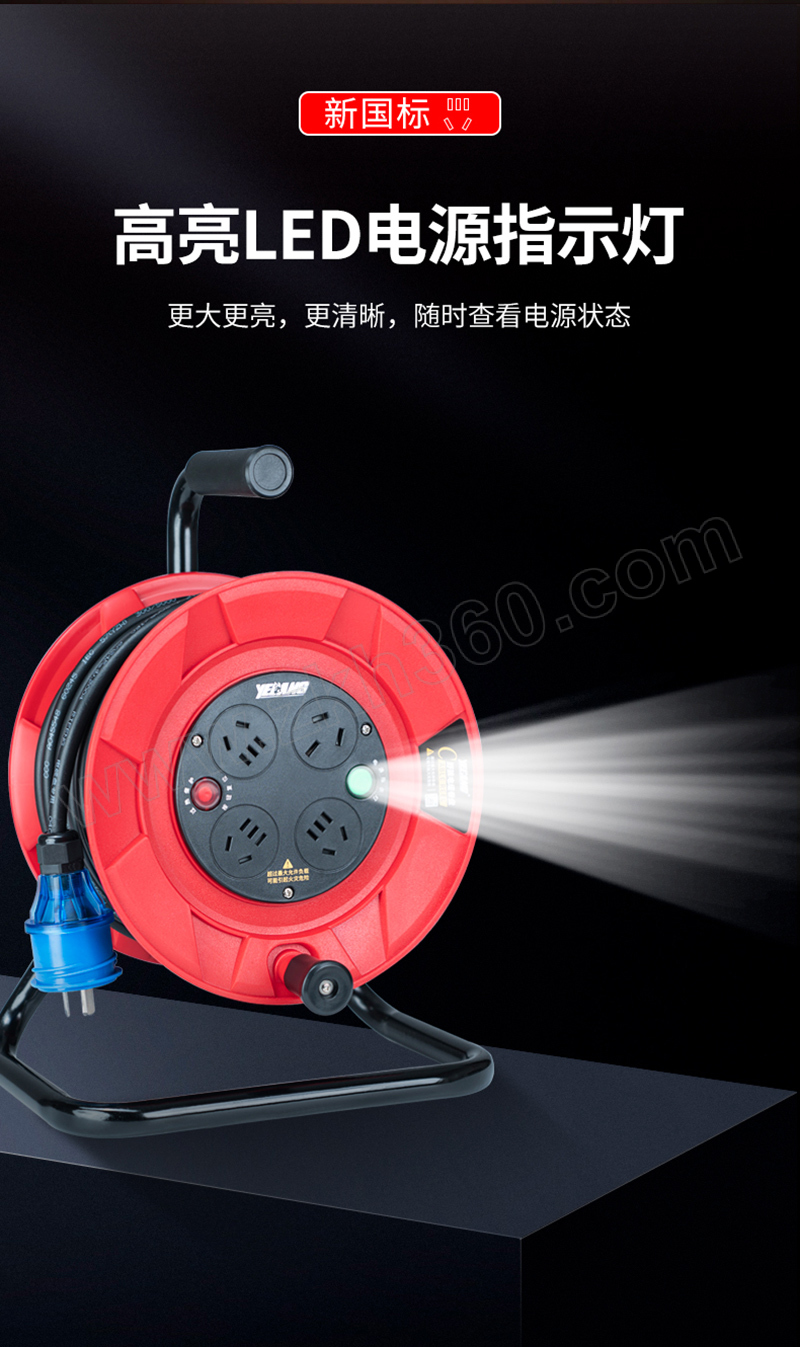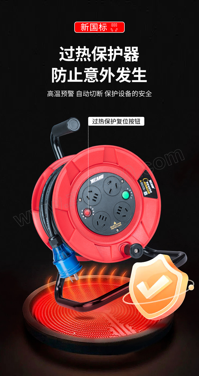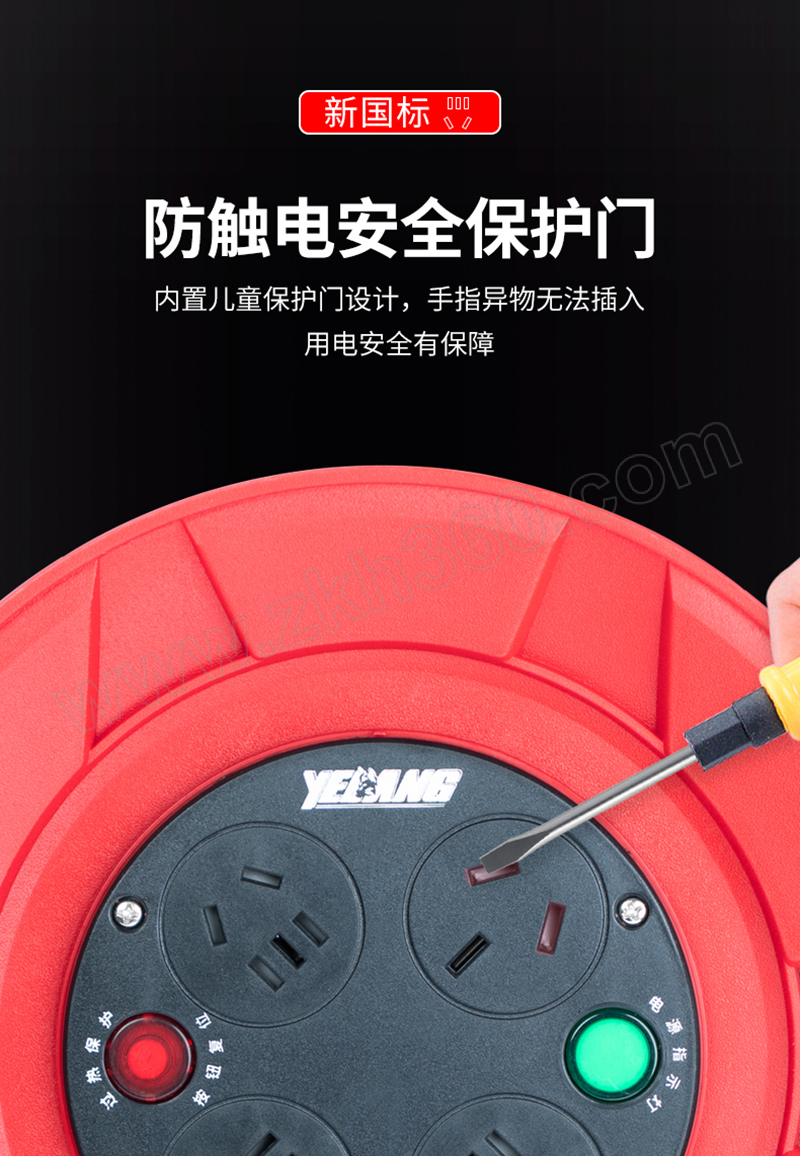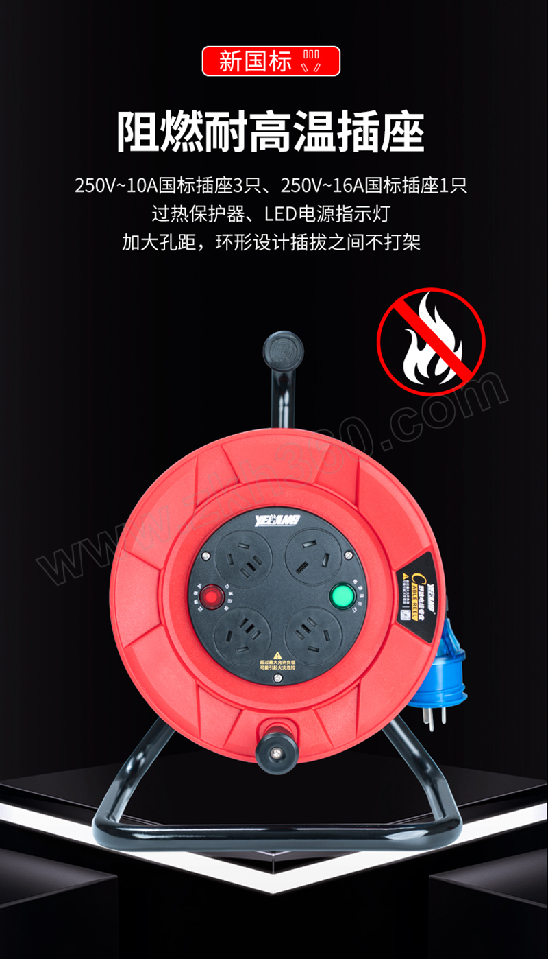 ·250V10A新国标五扁孔插座3只16A三孔插座1只; ·儿童防护门保护、过热保护、LED指示灯 ·钢管编织工艺支架,工程塑料盘体,阻燃插座; ·快速接线盒,防脱线束线夹