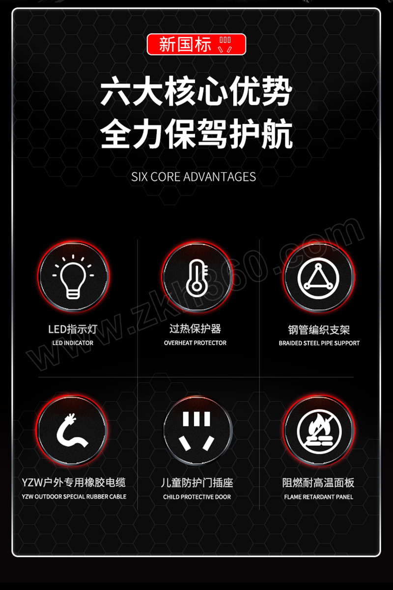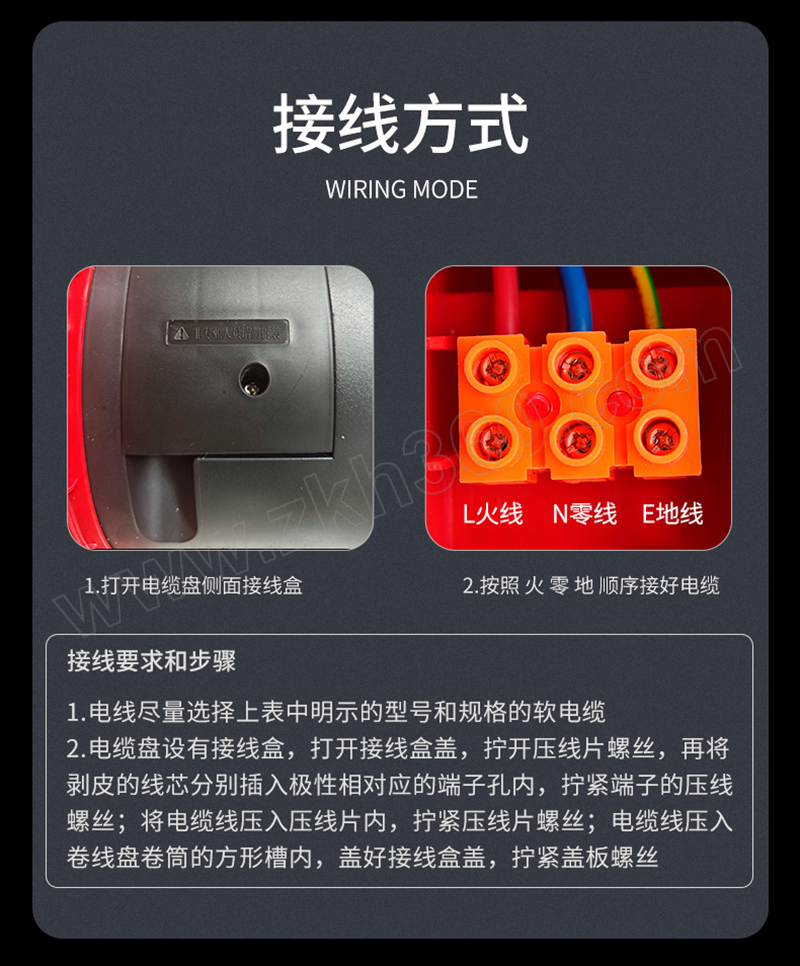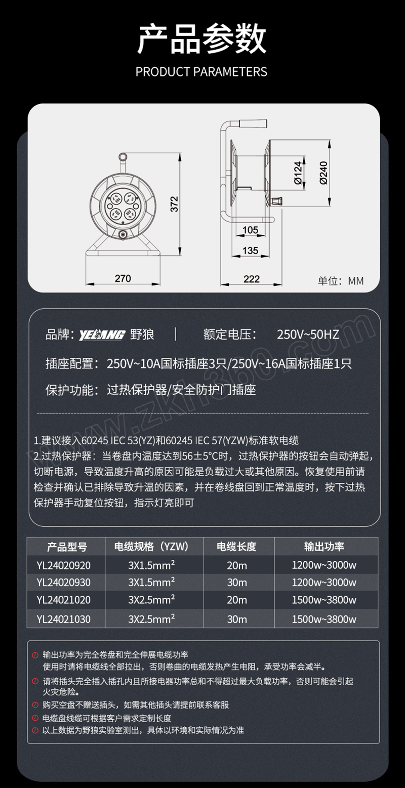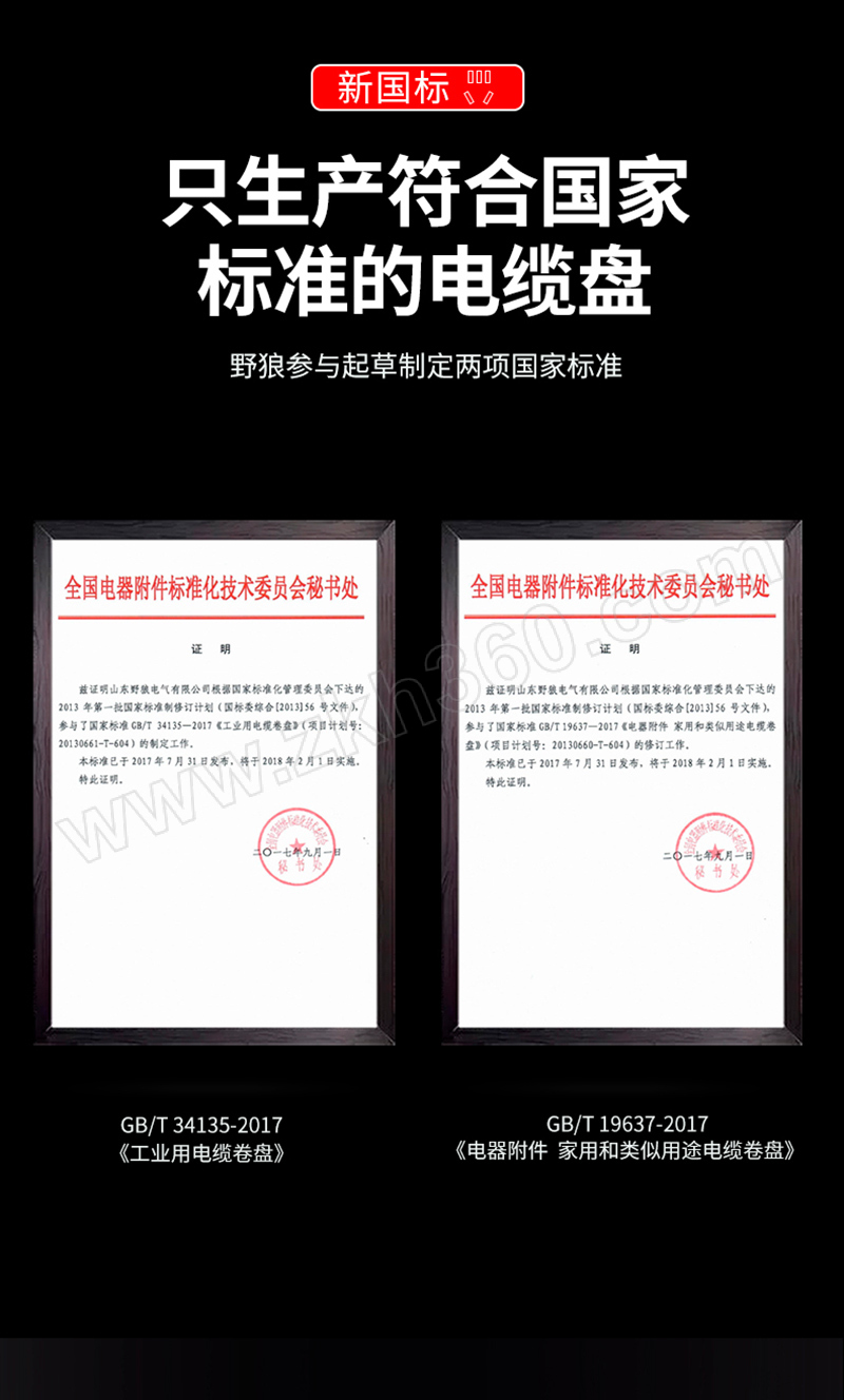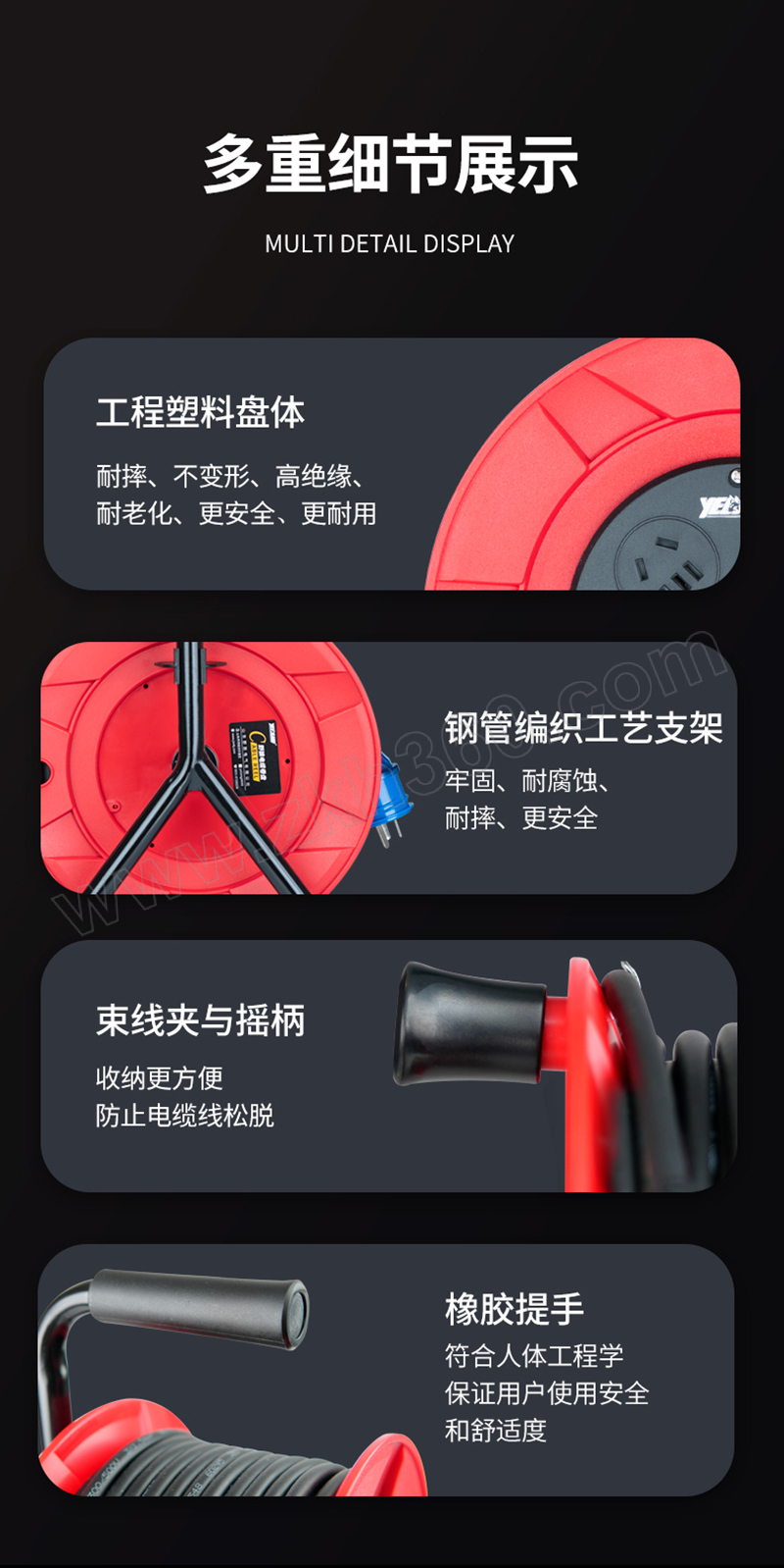 ·250V10A新国标五扁孔插座3只16A三孔插座1只; ·儿童防护门保护、过热保护、LED指示灯 ·钢管编织工艺支架,工程塑料盘体,阻燃插座; ·快速接线盒,防脱线束线夹