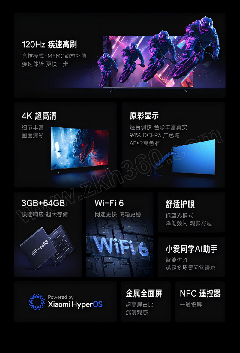 | 包装清单 | 屏幕1个 底座组件2个 安全提示和安装说明1 份 螺丝包1个 NFC蓝牙语音遥控器 1个含电池 电源线1 条 |