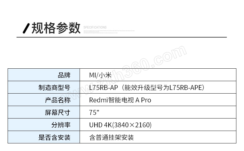 | 核心规格 | 75" 含普通挂架 含安装 节能版 黑色 (请通电验收) |