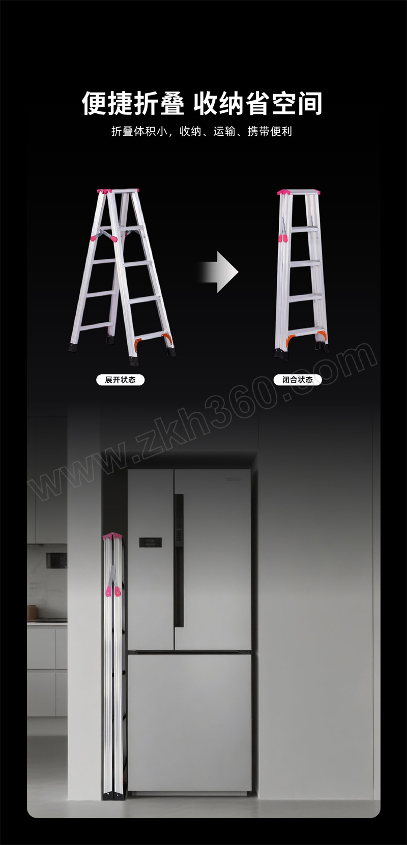 ·全铝合金材质,防滑踏板,操作简单,A字形双向站立,携带方便,收纳简单
