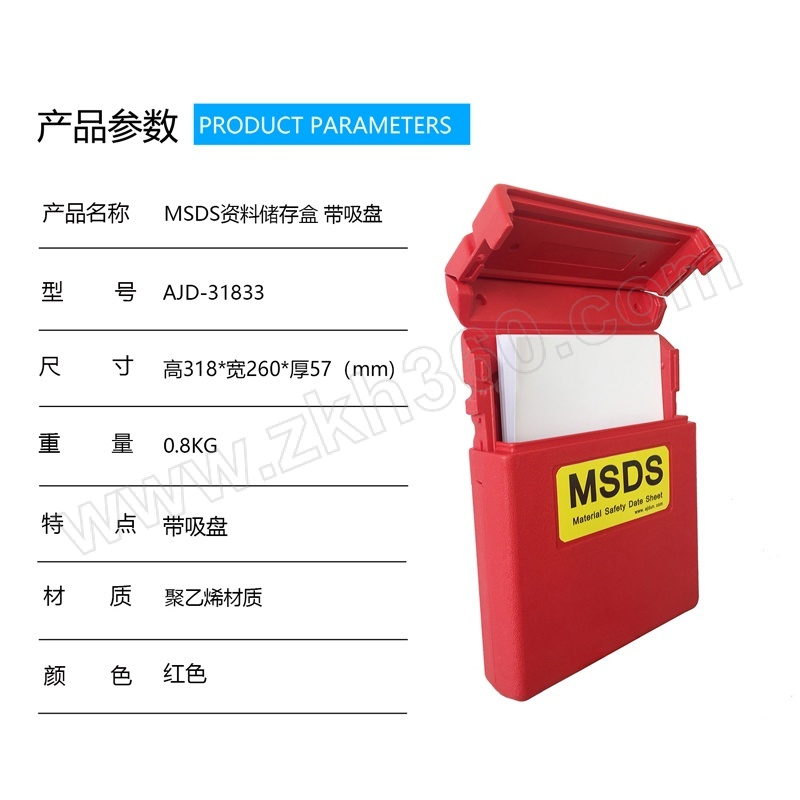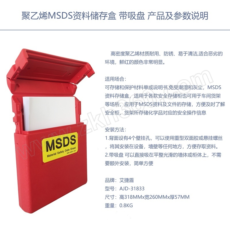 ·聚乙烯MSDS资料储存盒带吸盘 ·高密度聚乙烯材质耐用、防锈、易于清洁,适合恶劣的环境,鲜红的颜色非常明显。 ·适用场合:可存储和保护材料单或说明书,免受潮湿和灰尘,MSDS资料存储盒,适用于各款安全存储柜也可用于车间货架等场所,应用于MSDS资料及文件的存储,方便及时了解安全柜,货架所存储化学品对应的安全操作信息;