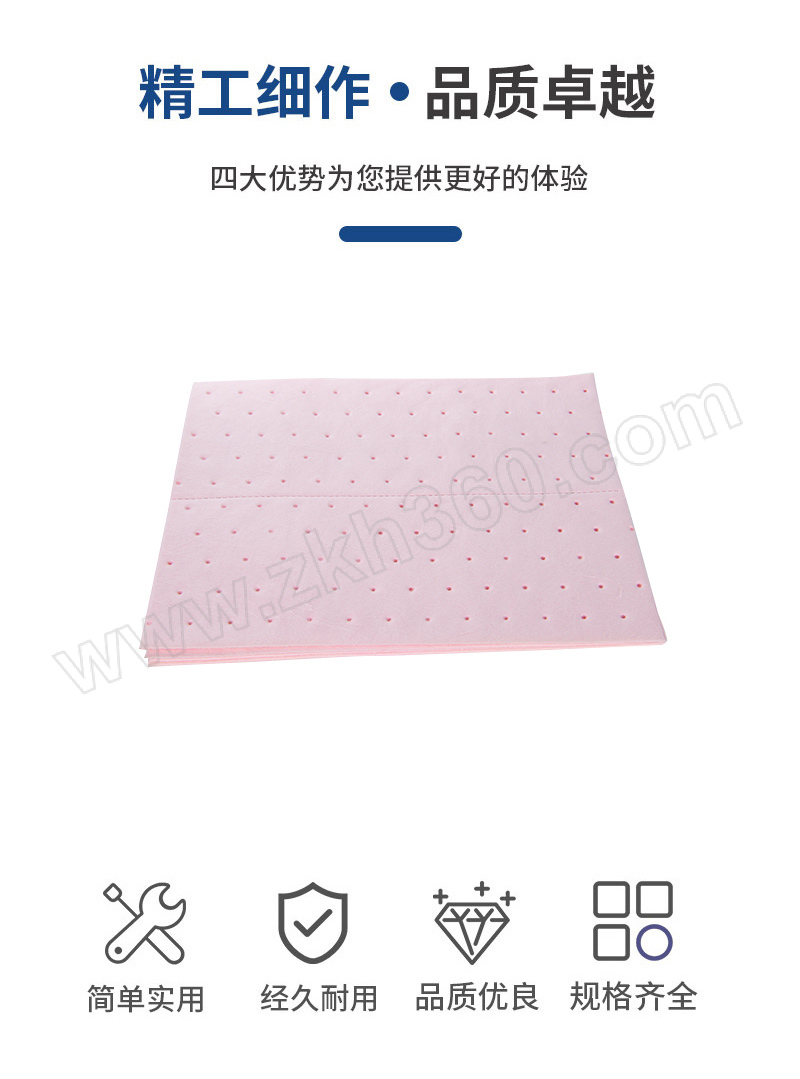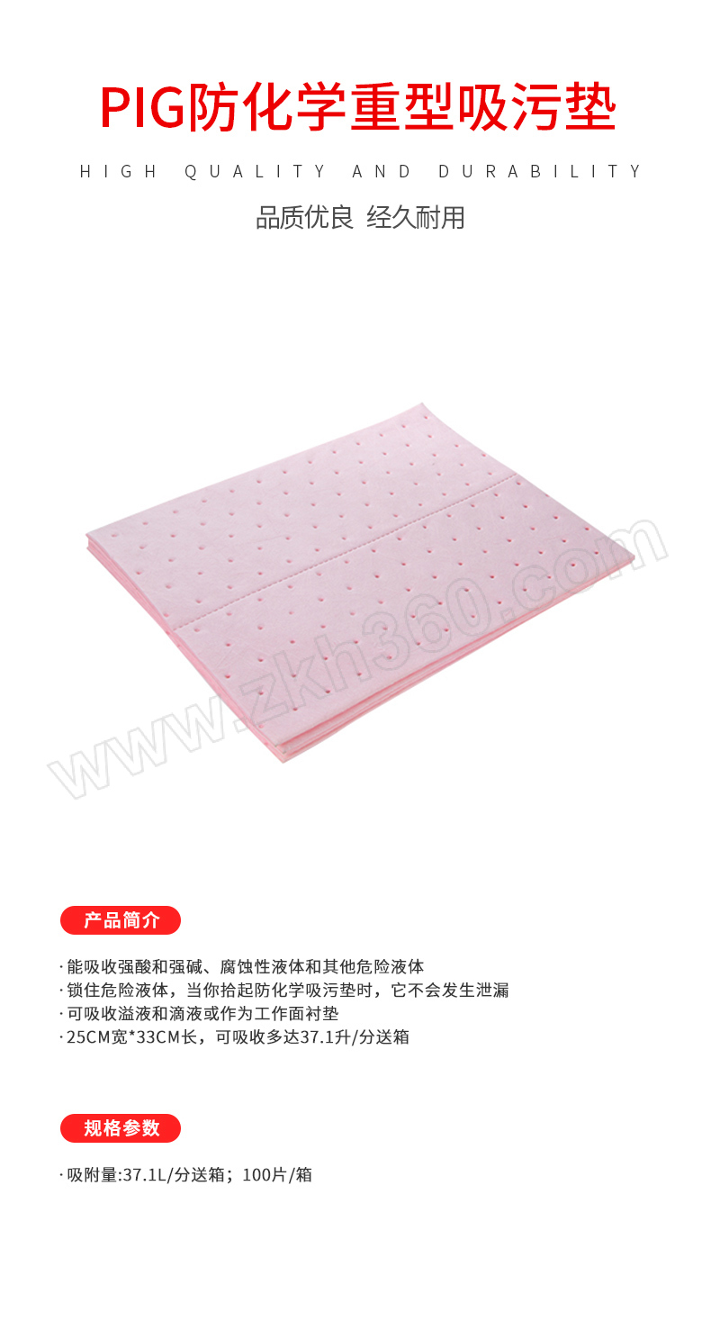 ·能吸收强酸和强碱、腐蚀性液体和其他危险液体 ·锁住危险液体,当你拾起防化学吸污垫时,它不会发生泄漏 ·可吸收溢液和滴液或作为工作面衬垫 ·25cm宽*33cm长,可吸收多达37.1升/分送箱