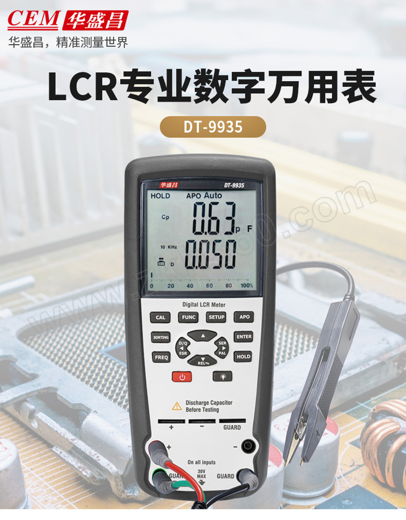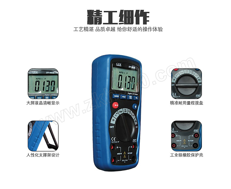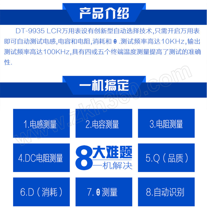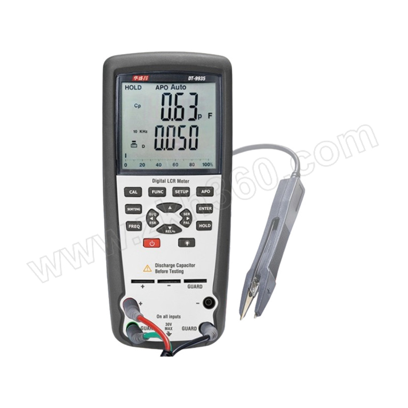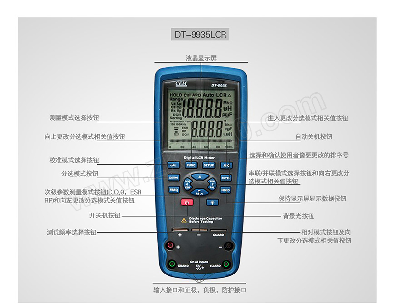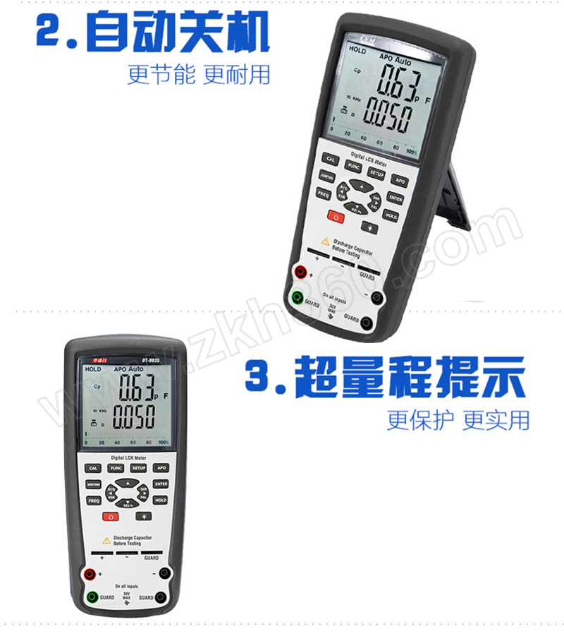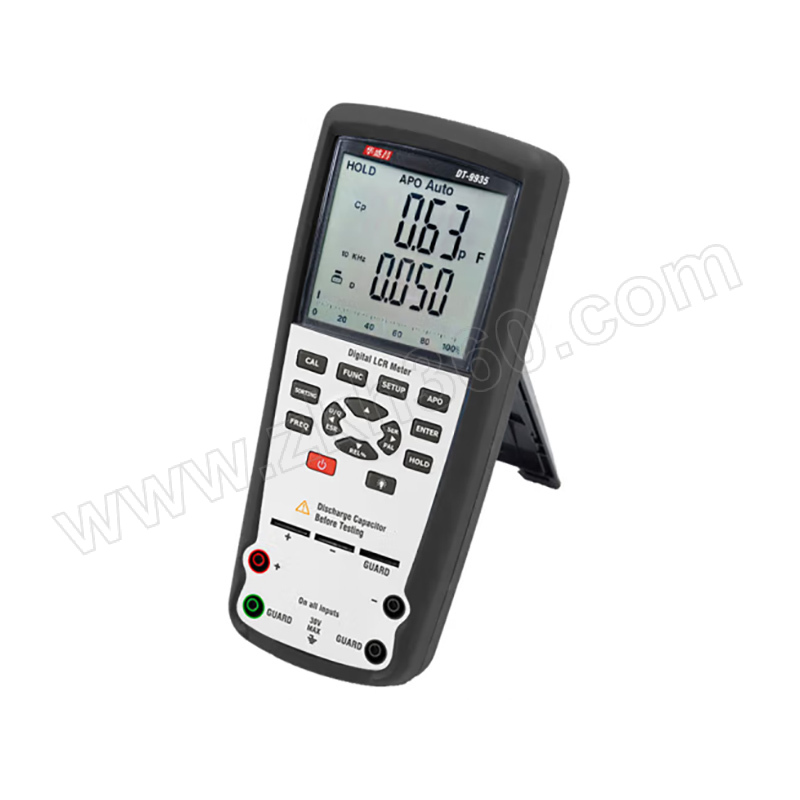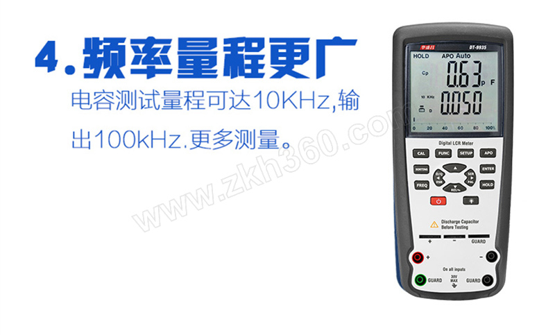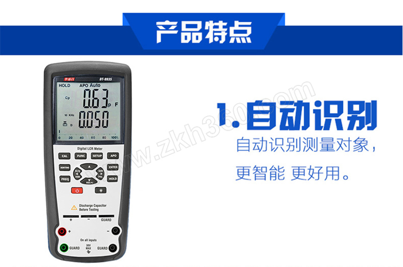 ·DT-9935 LCR万用表设有创新型自动选择技术,只需开启万用表即可自动测试电感,电容和电阻,消耗和θ.测试频率高达10KHz,输出测试频率高达100KHz,具有四或五个终端温度测量 ·提高了测试的准确性. ·超量程提示 ·低电提示 ·自动关机