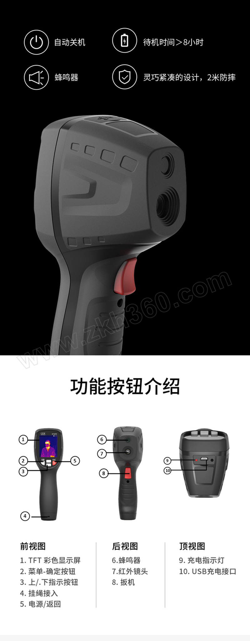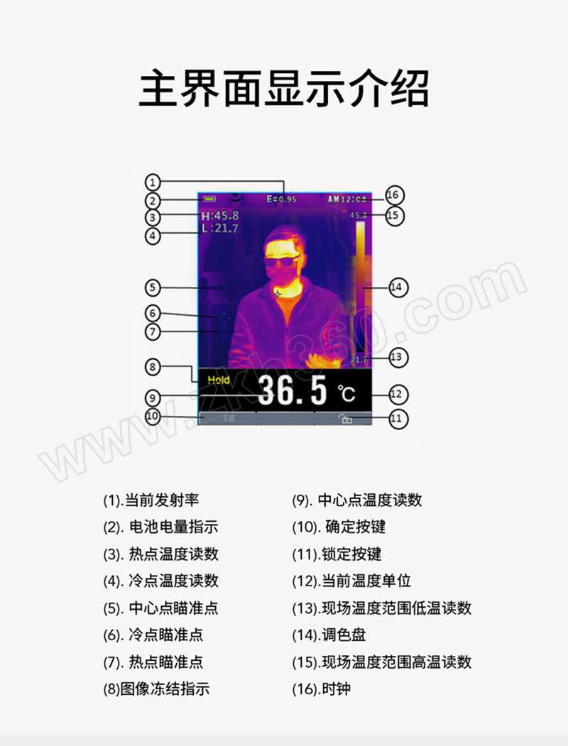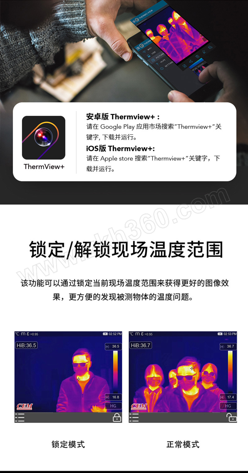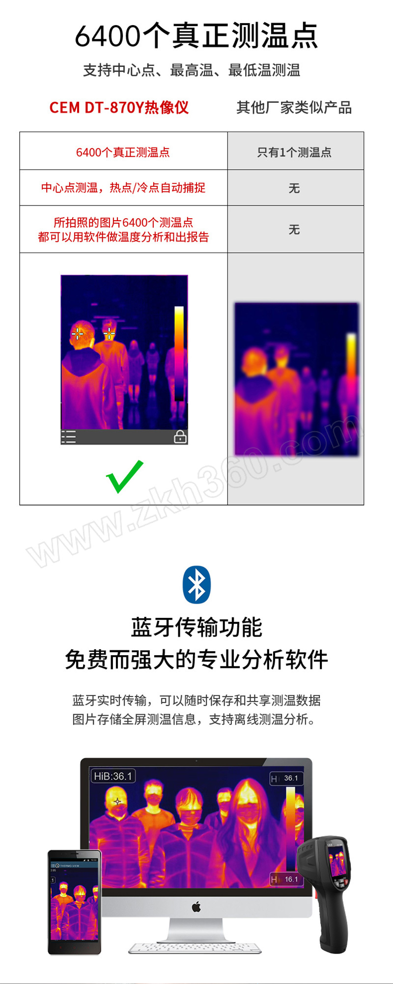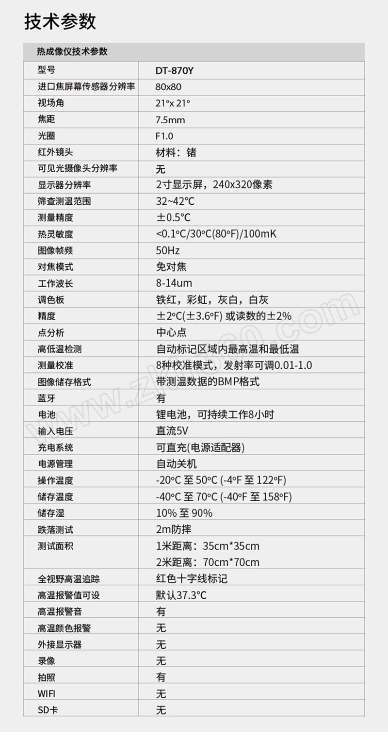 ·测温范围 32C°~42C° 红外分辨率80×80 测量距离3m 精确度±0.3℃ ·该产品精度±0.3℃,可蓝牙连接手机实时监测,有超温声音报警,建议测试距离3米左右,可连接导出数据不能连接显示屏和电脑实时监控,测量速度快,短时间内可读取当前被测物体的表面温度 ·1/4三脚架接口