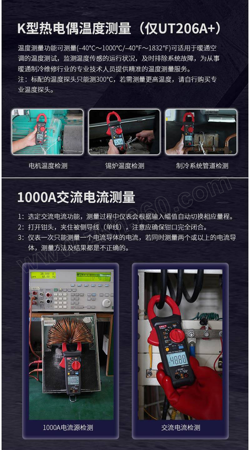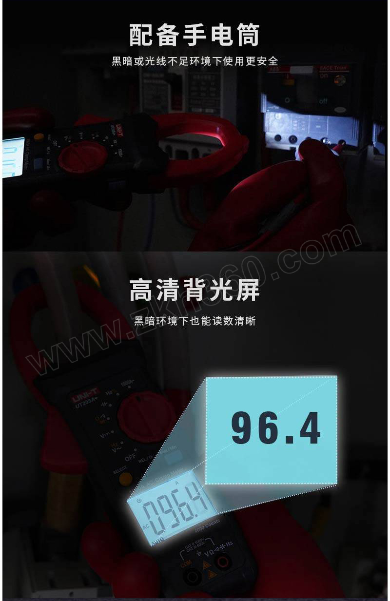 ·机身重量轻巧,便于单手及高空作业操作; ·交流电流1000A测量,频响达45Hz~1kHz; ·全方位防误操作保护; ·600A浪涌测量; ·温度(摄氏℃/华氏℉); ·NCV非接触验电功能; ·产品设置过压、过流报警提示; ·电路设置自动省电功能; ·配备手电筒/背光