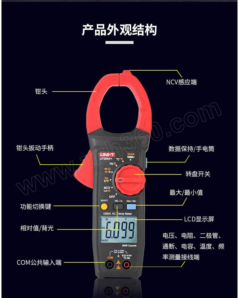 | 功能 | 直流电压测量,交流电压测量,直流电流测量,交流电流测量,电阻测量,温度测量,频率测量,电容测试,NCV测量,二极管测试,通断测试,其他 |
