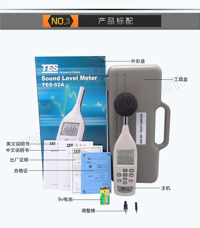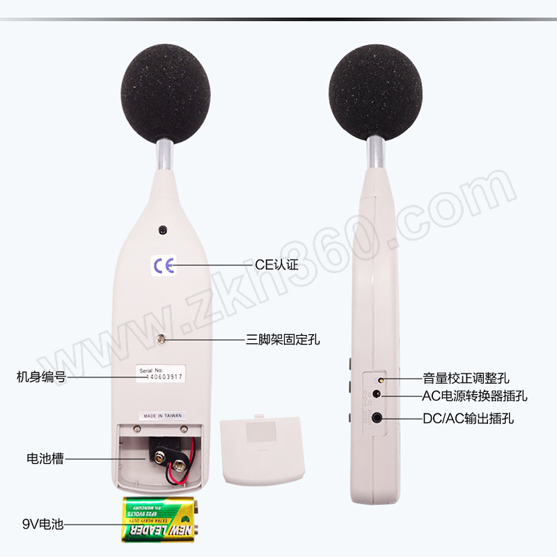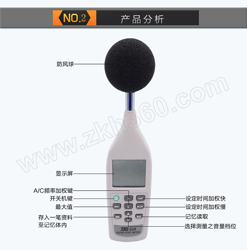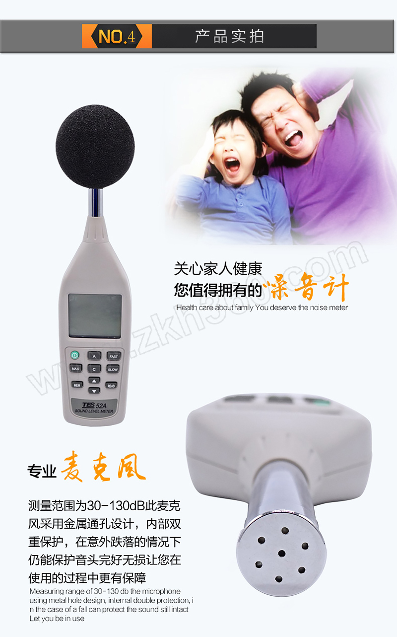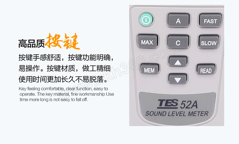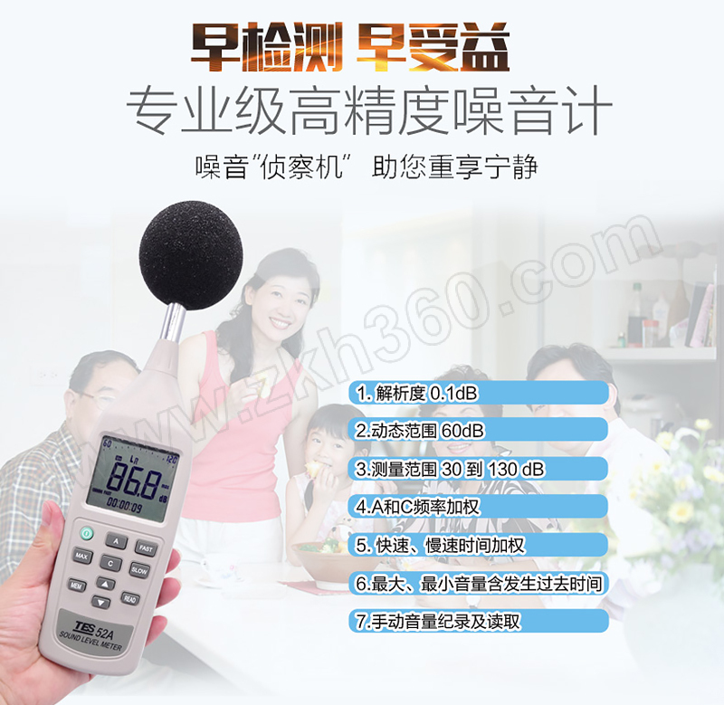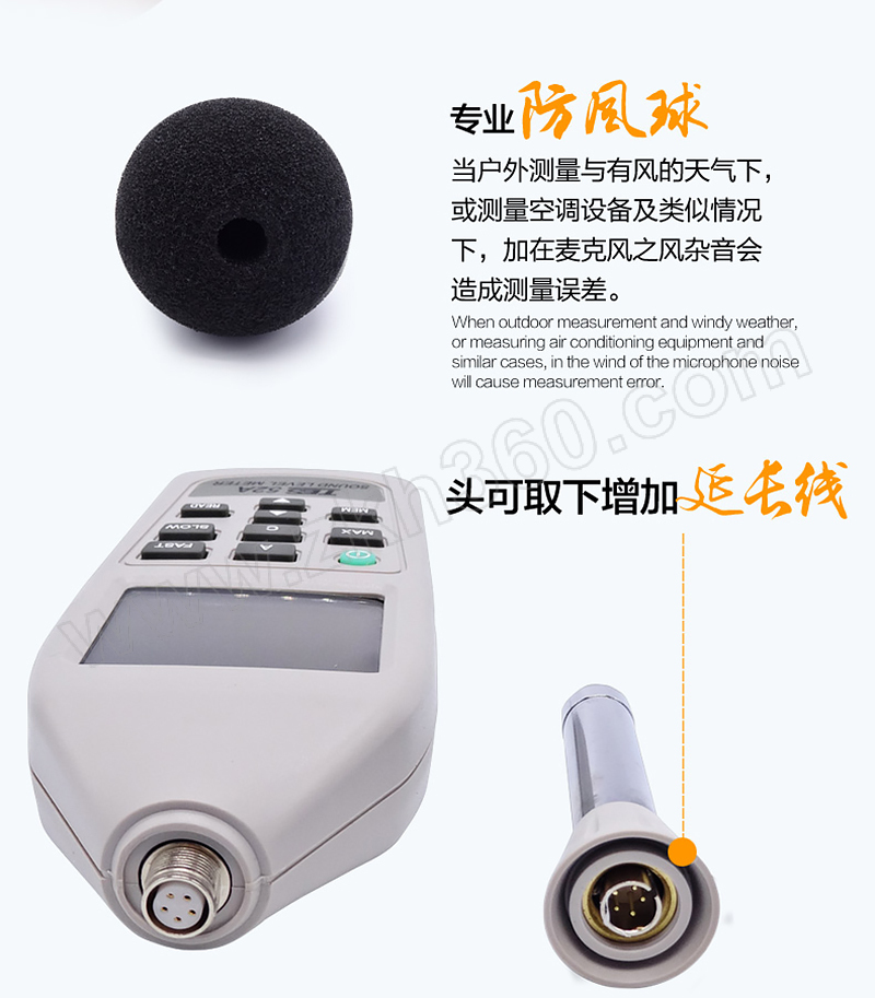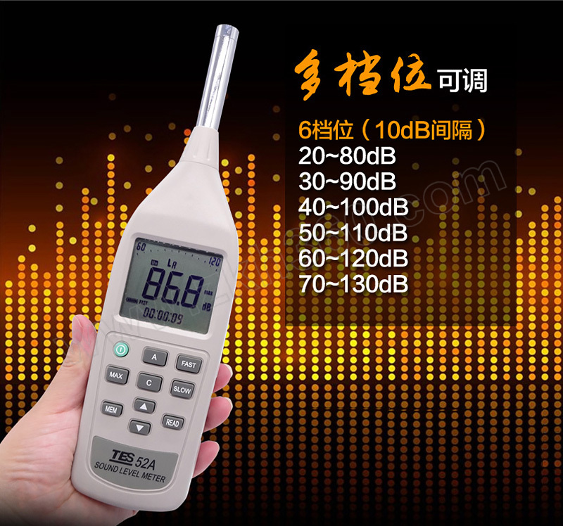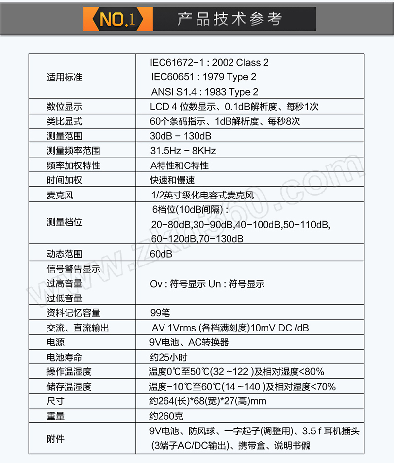 ·解析度 0.1dB ·动态范围 60dB ·测量范围 30 到 130 dB ·A和C频率加权 ·快速、慢速时间加权 ·最大、最小及峯值音量含发生时间 ·手动音量纪录及读取
