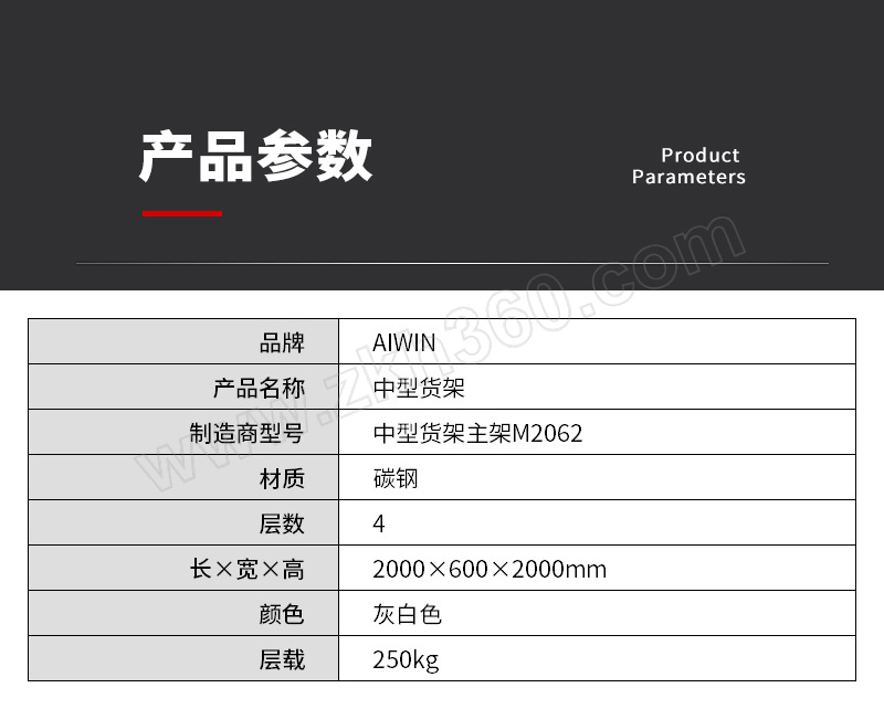 | 核心规格 | 2000×600×2000 4层 灰色 单层均载250kg |