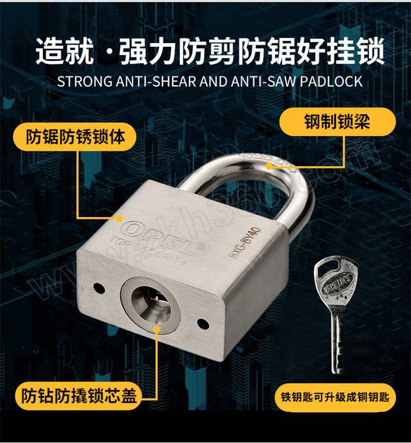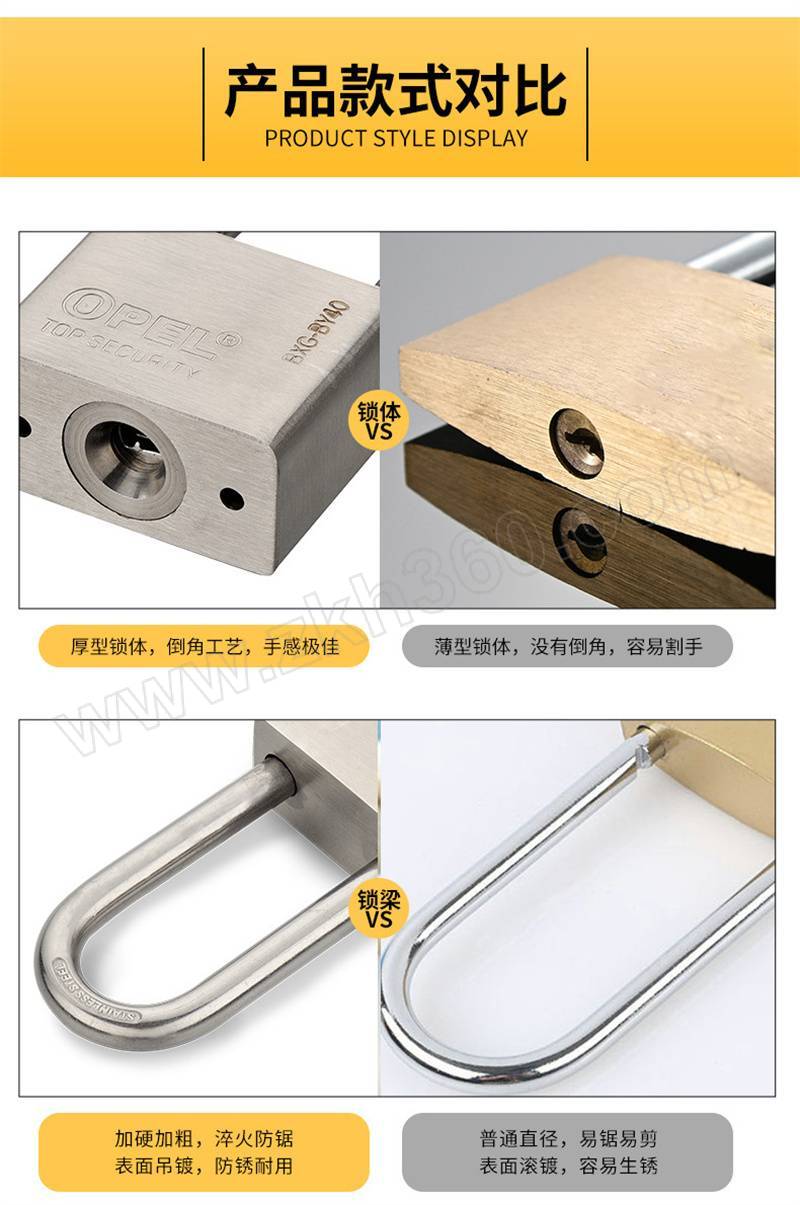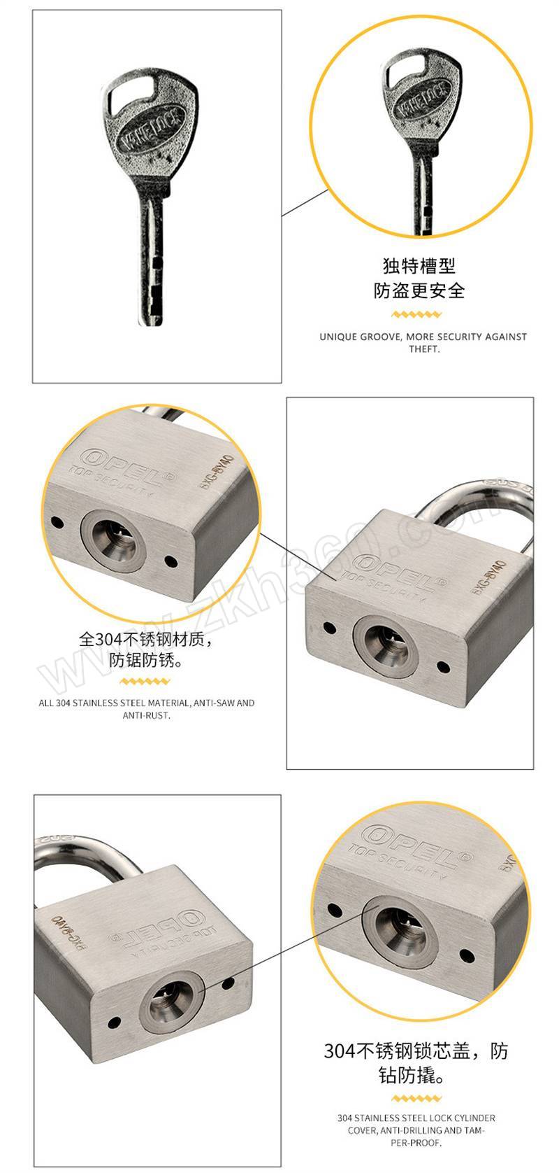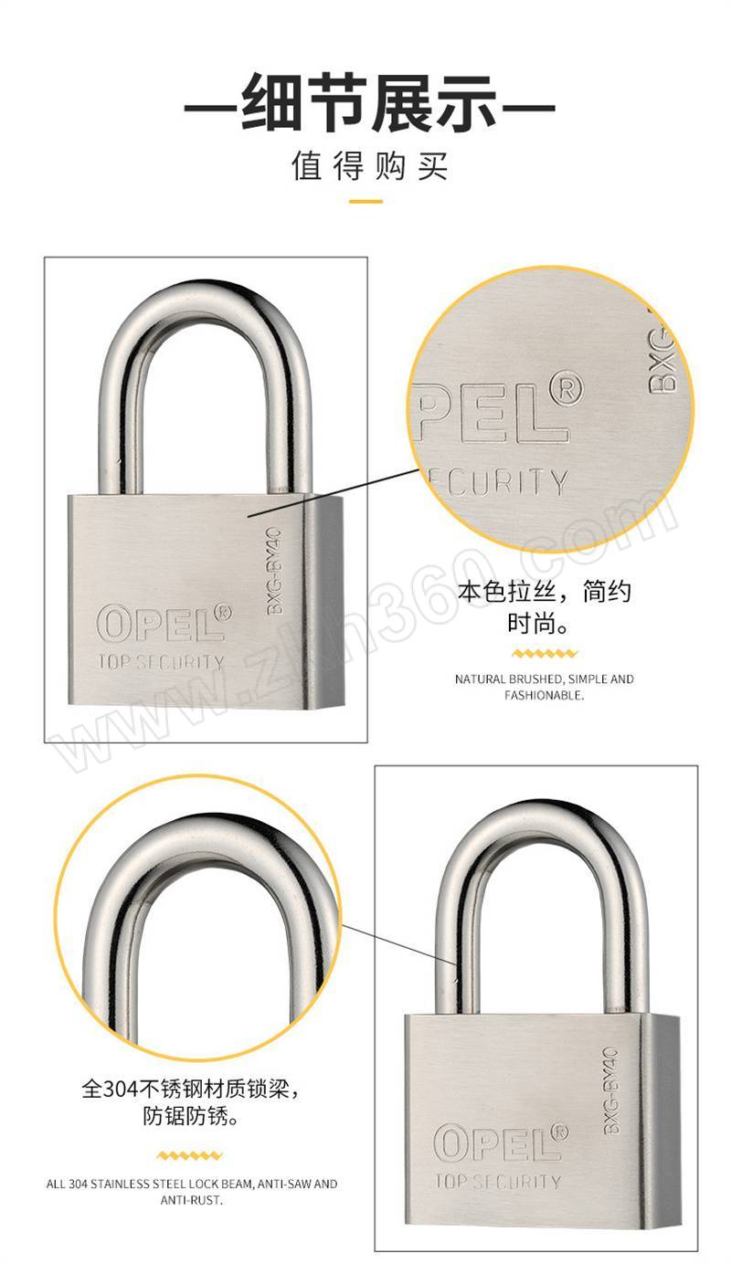 ·锁梁:全304不锈钢材质,防锯防锈。 ·锁体:全304不锈钢材质,防锯防锈。 ·表面:本色拉丝,简约时尚。 ·钥匙:铁钥匙,独特槽型,防盗更安全。 ·锁芯盖:304不锈钢锁芯盖,防钻防撬