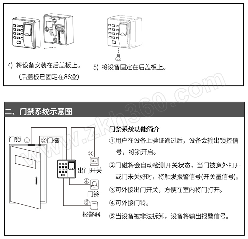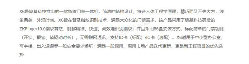 ·同时支持指纹、卡、密码验证方式 ·操作简便,无需联网通讯 ·采用ZKFinger10.0算法,比对快,误判低