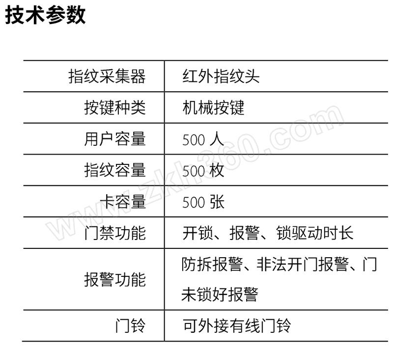 | 指纹/ID卡容量 | 500枚 |