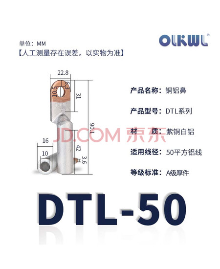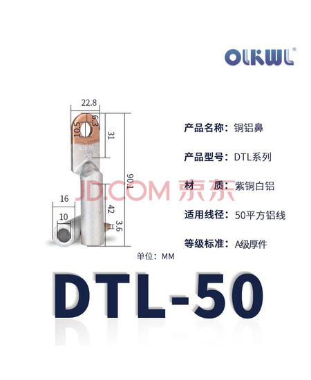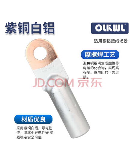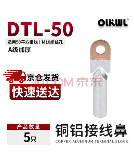 OLKWL(瓦力)铜铝鼻子A级加厚铜铝过渡连接端子50平方电缆铝线线鼻子接线耳 DTL-50(5只)