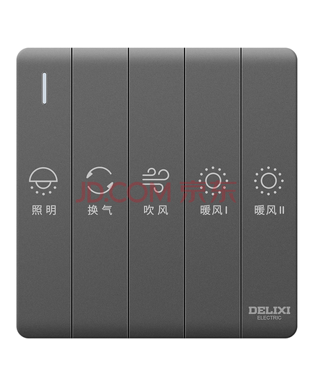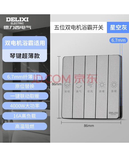 德力西(DELIXI)86型浴霸开关卫生间浴室超薄琴键开关面板 五位双电机灰色