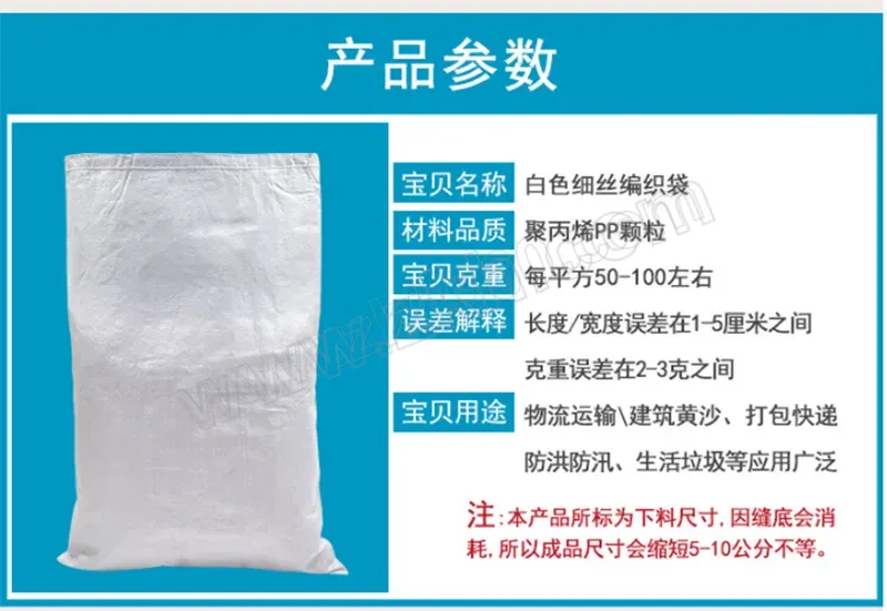 ·采用先进热切工艺,编织袋切口整齐,避免脱丝,断丝。 ·针脚细密、粗线缝底、大大提高袋子的承重能力和抗压性能。 ·采用细丝编织,使得编织密度更加紧凑,提高承重能力。 ·采用优质聚丙烯PP颗粒作为原料,从根本提高编织袋拉力。