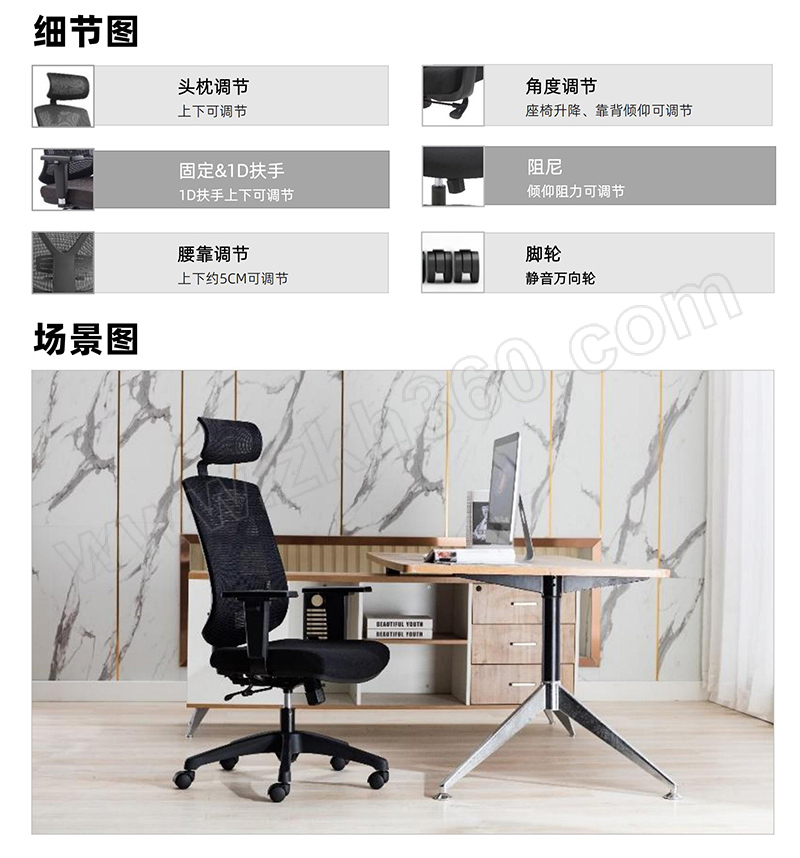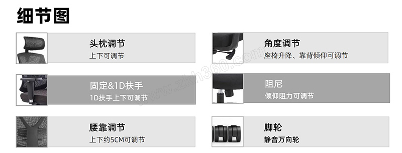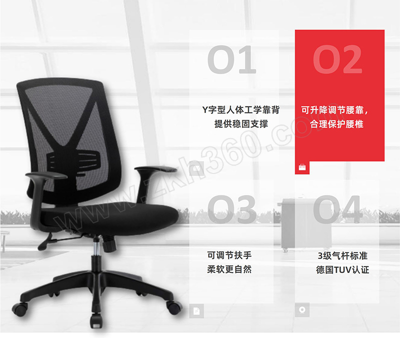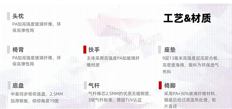 ·设计理念: ·高性价比的代表,Y字型人体工学靠背,提供稳固支撑;可升降调节腰靠,合理保护腰椎;可调节扶手,柔软更自然;办公环境需求的上佳选择。 ·工艺&材质: ·头枕:骨架PA材质加高强度玻璃纤维,面料为环保透气优质高弹性网布 ·椅背:骨架PA材质加高强度玻璃纤维,面料为环保透气优质高弹性网布 ·扶手:主体采用高强度PA加玻璃纤维材质 ·座垫:9层13毫米高强度层压胶合板,高密度海绵,面料为环保透气布料 ·底盘:中泰同步倾仰底盘,2.5MM加厚钢板,倾仰角度19度 ·气杆:气杆棒芯2.5MM的优质无缝钢管,3级气杆标准,德国TUV认证 ·椅脚:采用PA+30%玻璃纤维材料,注塑一体成型,椅脚直径700mm ·脚轮:采用PA+30%玻璃纤维材料,组装后经过高温热处理,轮片直径