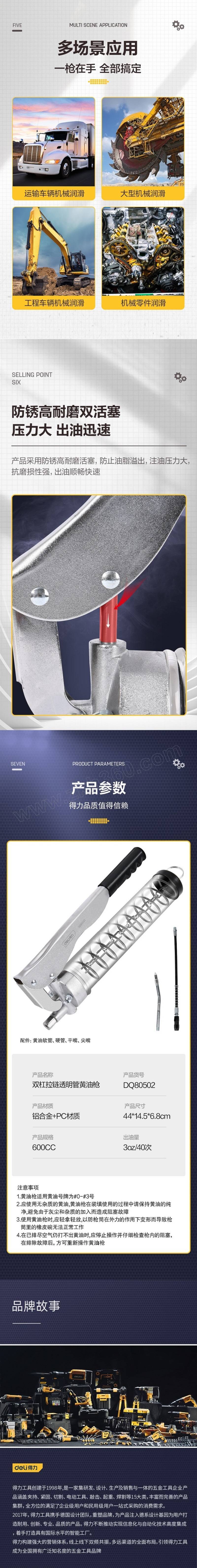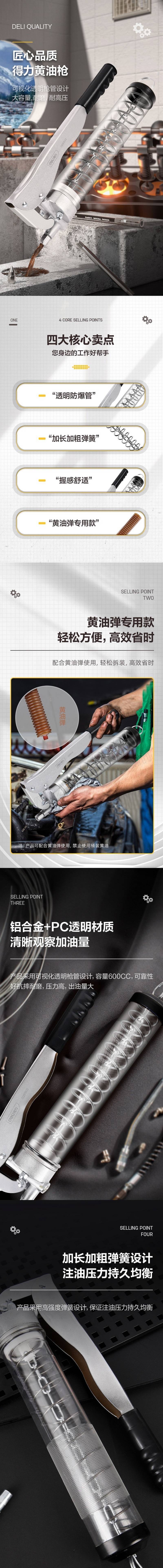 ·高强度透明枪筒,一体成型,防爆耐摔抗冲击·合金铝精密压铸枪头、耐磨、耐压·独特枪头内部密封设计,注油压力高;高强度弹簧保证注油时压力持久均衡·按压式排气阀,出油顺畅;包胶手柄,握感增强;特有自锁装置,使用安全、方便。高强度弹簧确保使...