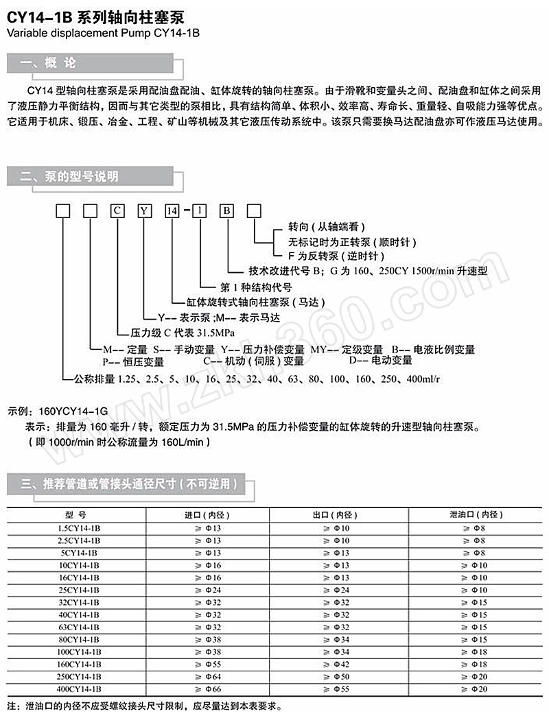 ·用于开式回路的斜盘式轴向柱塞泵 ·连续工作压力可达315bar,瞬时高压力可达400bar ·排量规格多,功率密度高 ·外观新颖,体积小,功率重量比大 ·变量形式多,有多种节能控制方式,且控制响应速度快 ·噪声低,高效率,高可靠性 ·优良的吸油性能 ·泵体与泵壳一体化设计,取消了刻度盘 ·与CY泵一致的安装法兰,与SAE通用的油口法兰设计