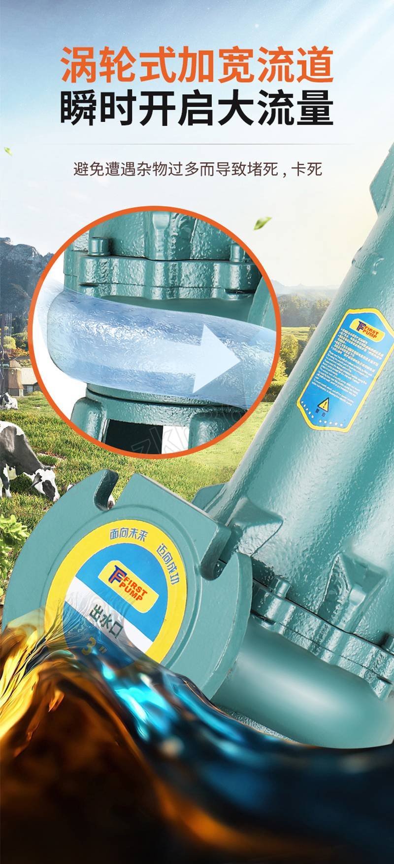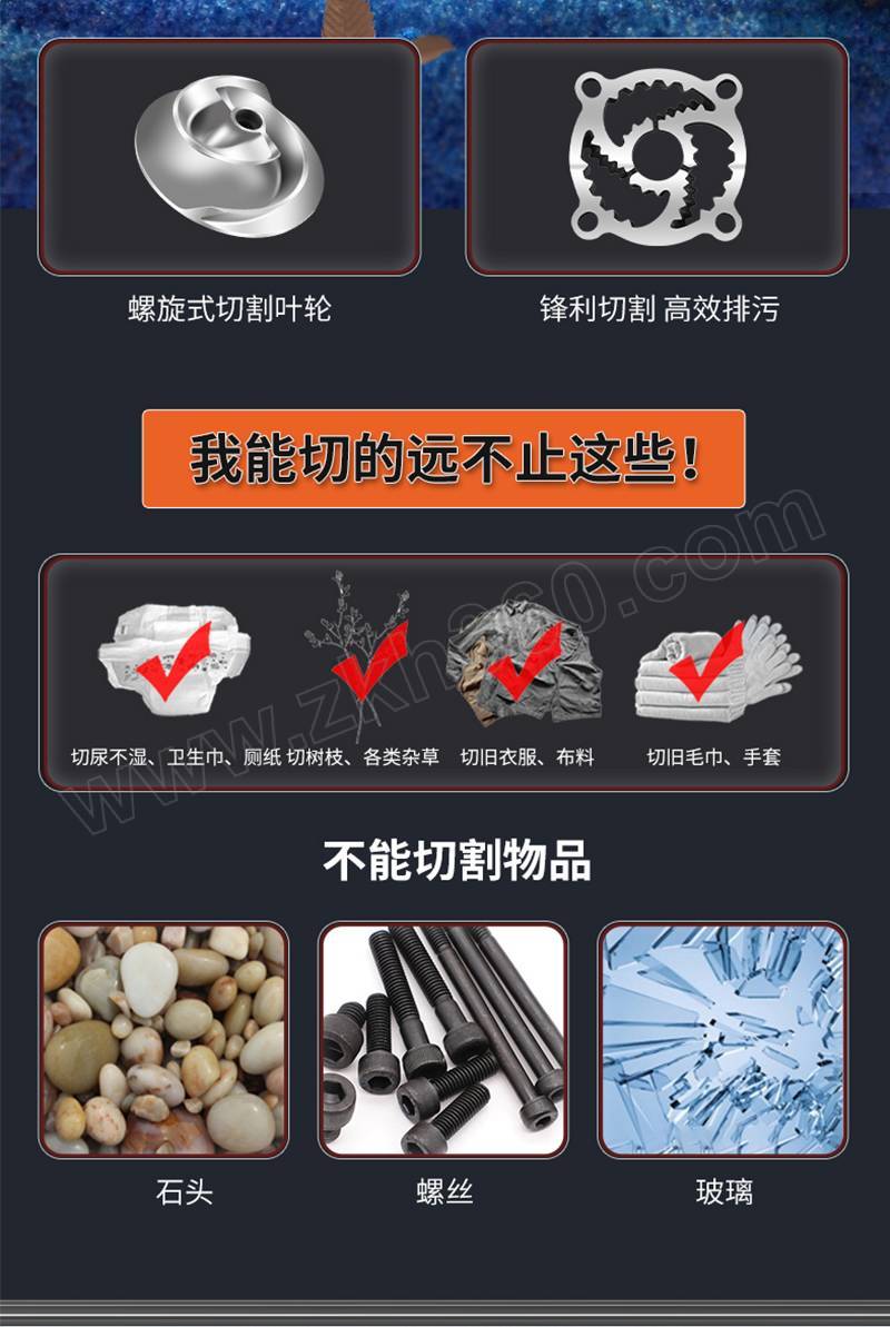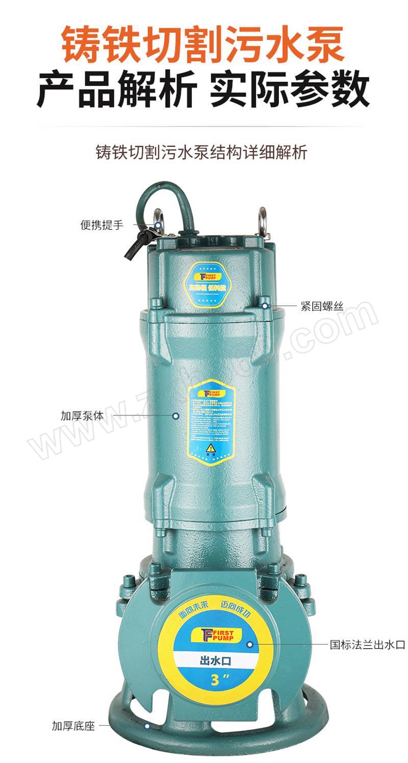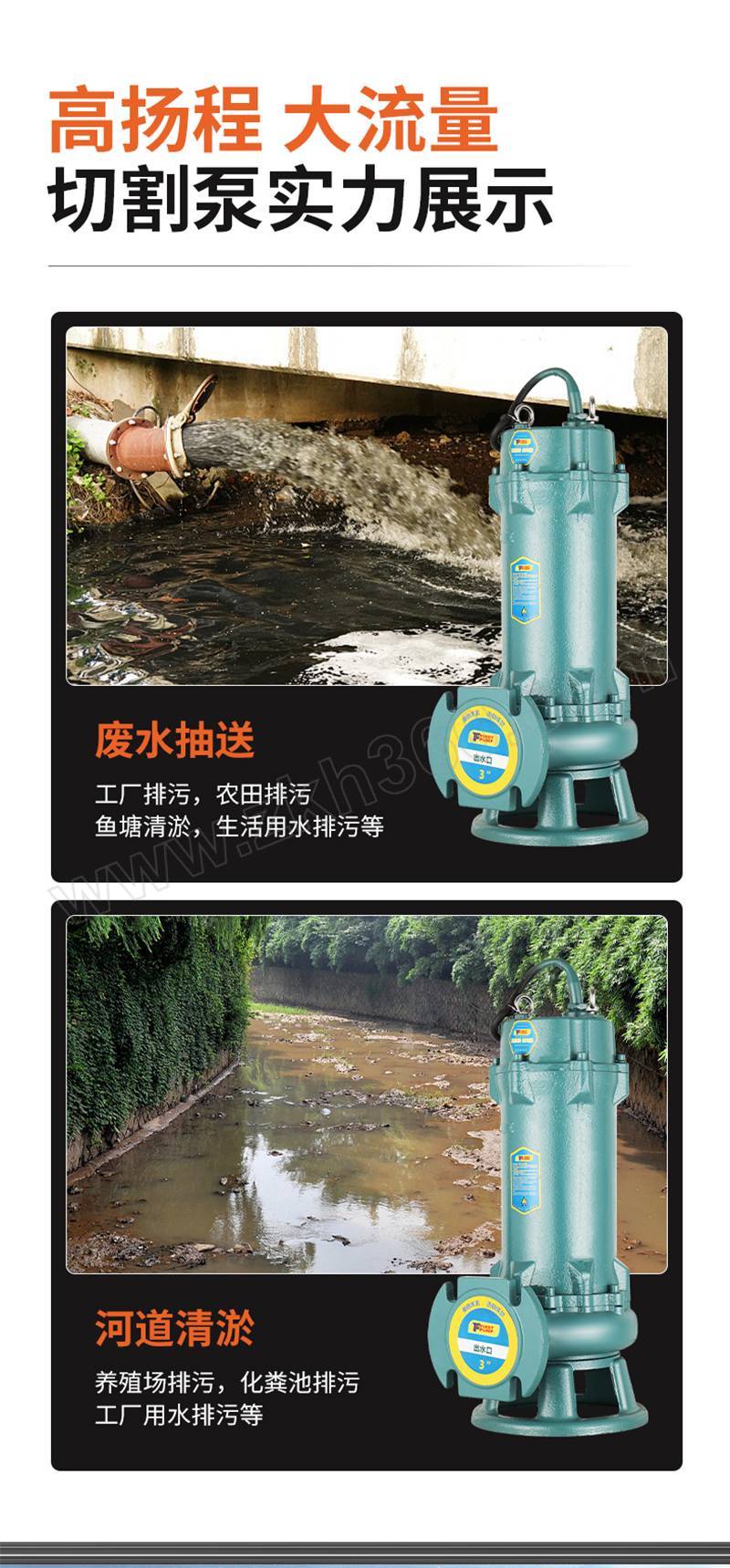 ·高强度切割式叶轮,可轻松切碎纤维,粪便,树枝等杂物,整体结构紧凑,体积小,噪声小,节能效果显著,检修方便,无需建泵房,潜入水中即可工作,大大减少工程造价