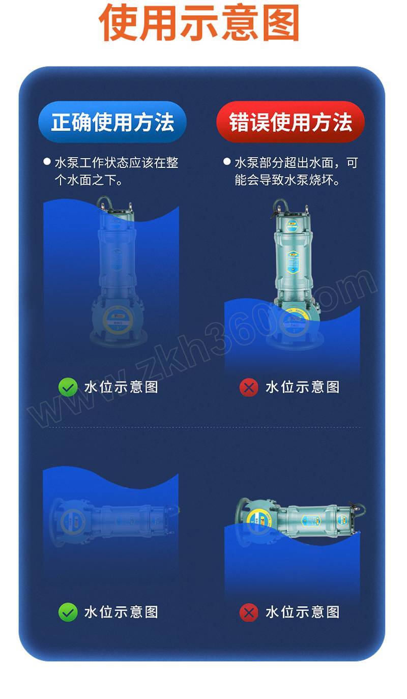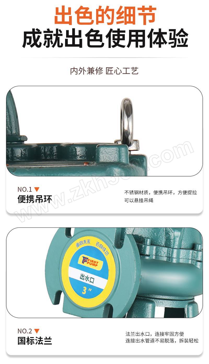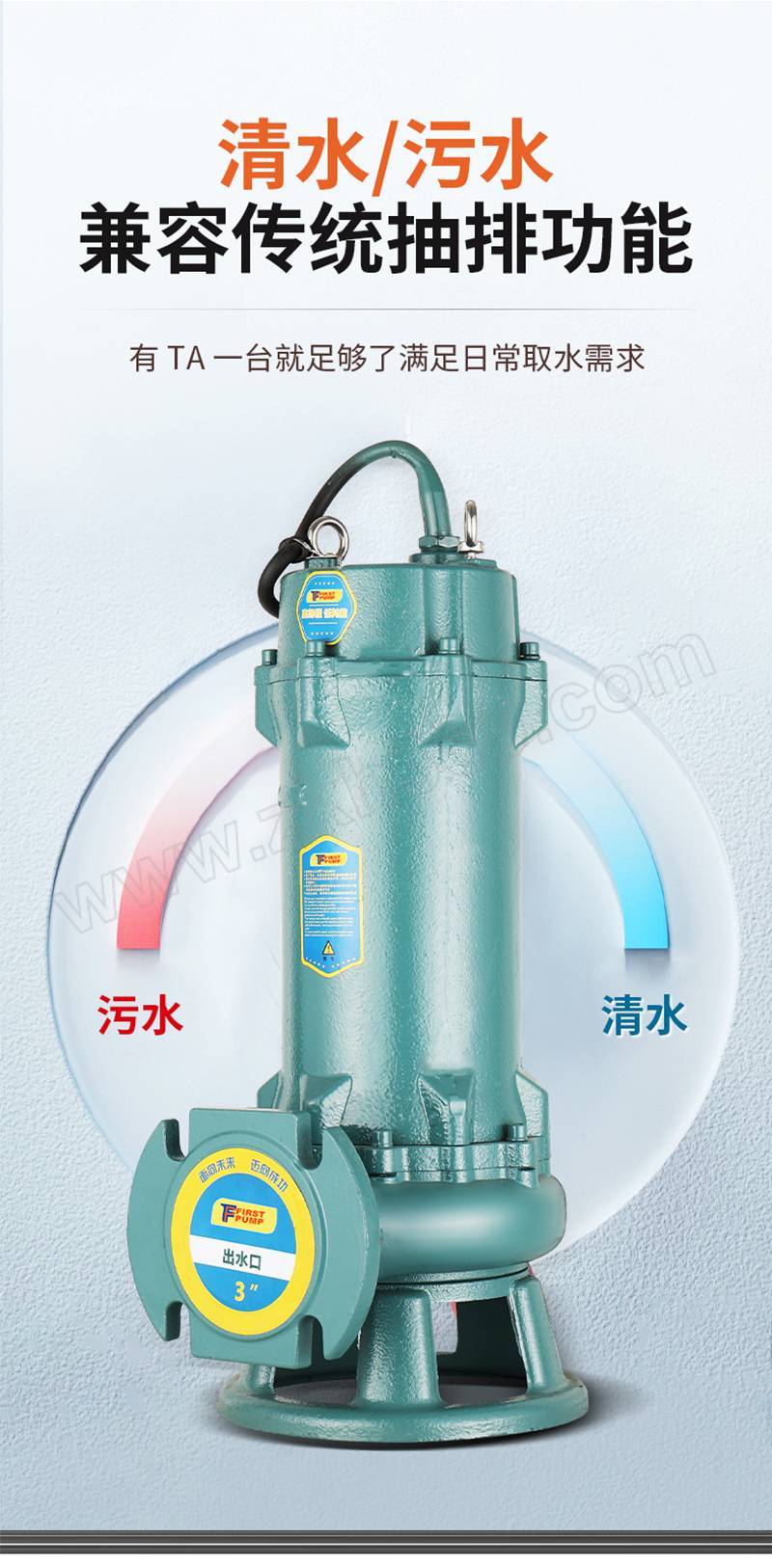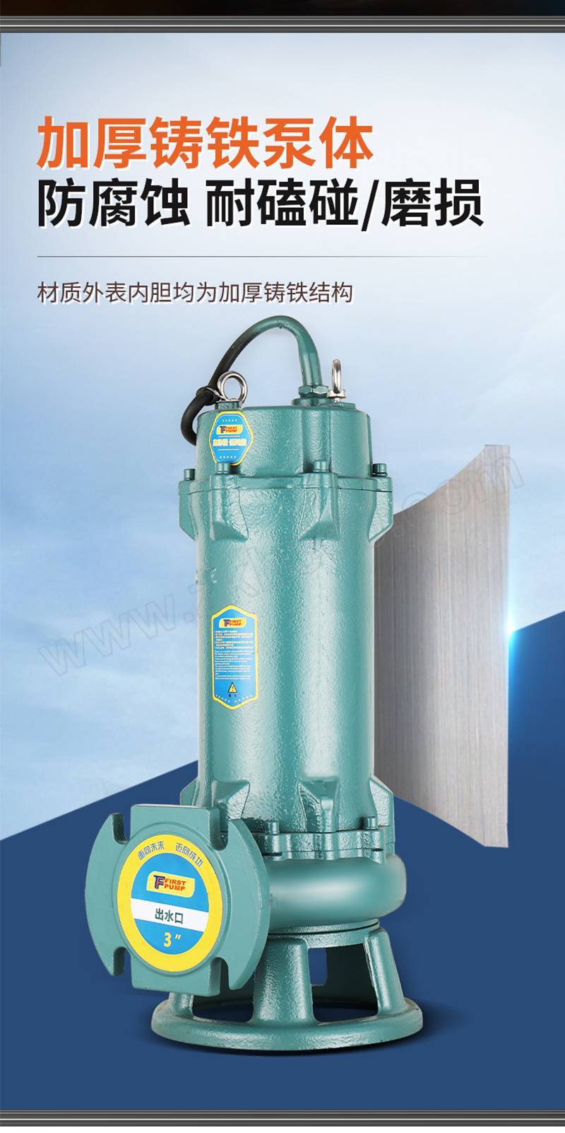 ·高强度切割式叶轮,可轻松切碎纤维,粪便,树枝等杂物,整体结构紧凑,体积小,噪声小,节能效果显著,检修方便,无需建泵房,潜入水中即可工作,大大减少工程造价