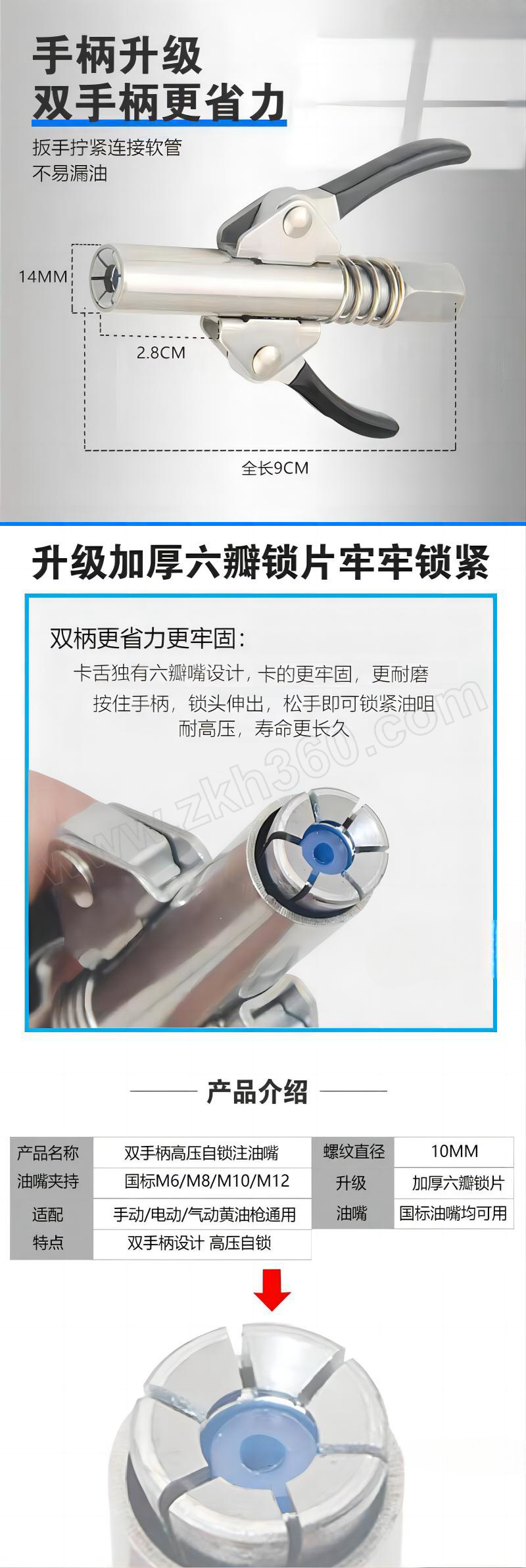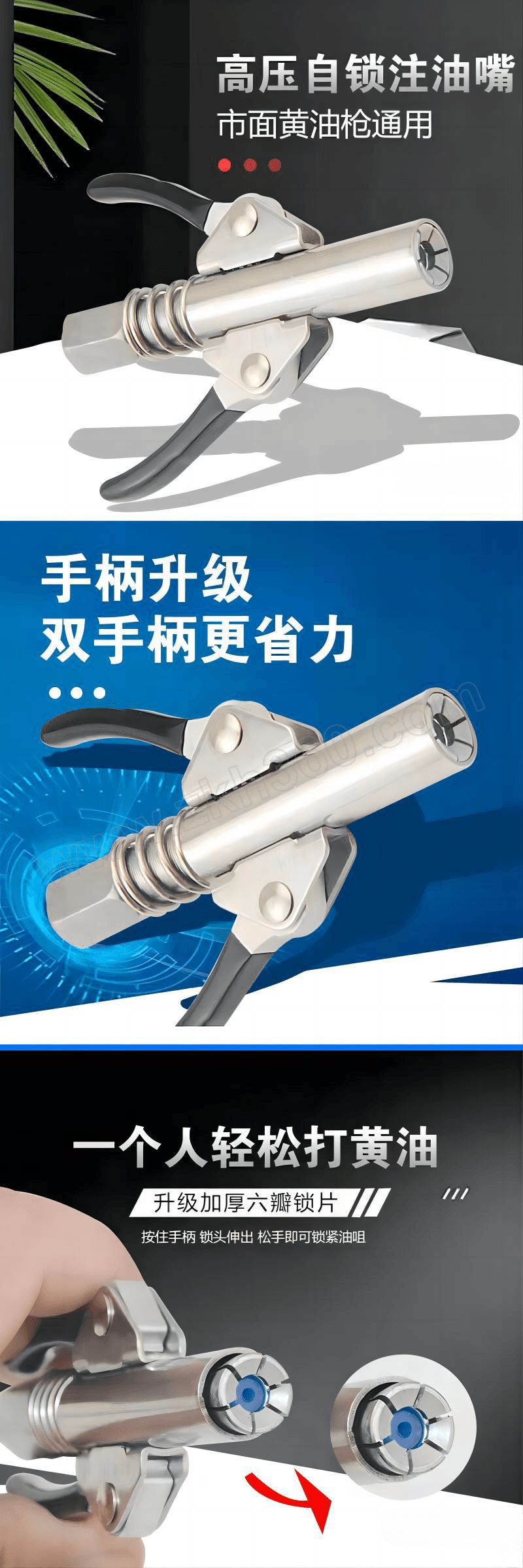 | 产品名称 | 铁制双柄齿轮6瓣款按压锁钳式高压自锁黄油枪注油嘴头 |