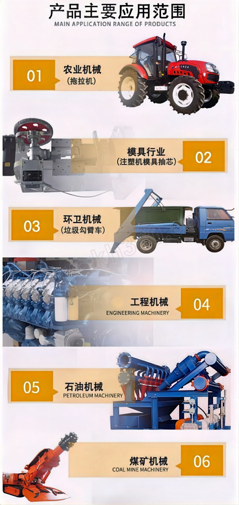 ·用于矿井液压支架、油田开发、工程建筑、起重运输、冶金锻压、矿山设备、船舶、注塑机械、农业机械、各种机床以及各工业部门机械化