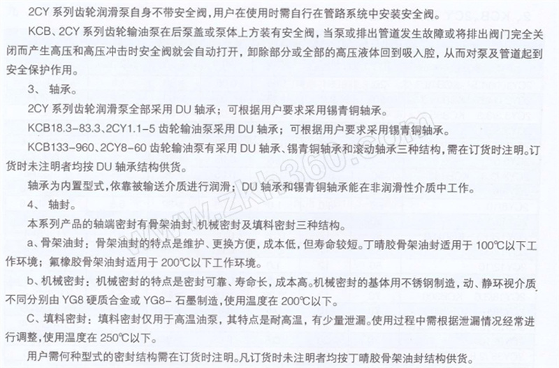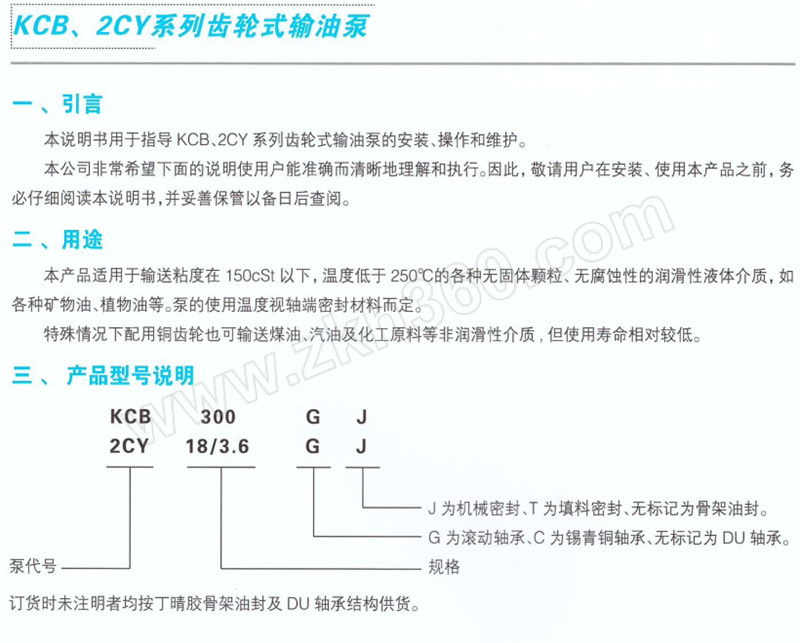 本产品适用于输送粘度在 150cSt 以下,温度低于 250℃的各种无固体颗粒、无腐蚀性的润滑性液体介质,如各种矿物油、植物油等。泵的使用温度视轴端密封材料而定。不可输送煤油、汽油及化工原料等非润滑性介质油品。