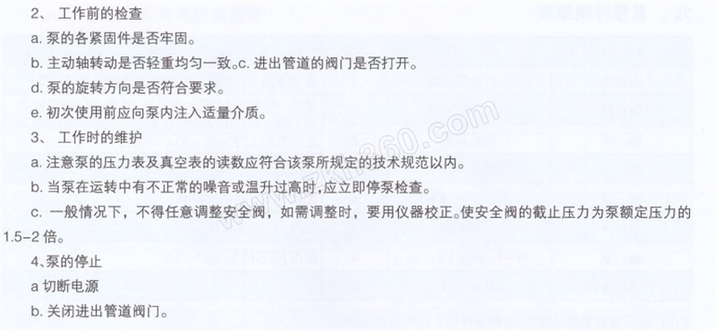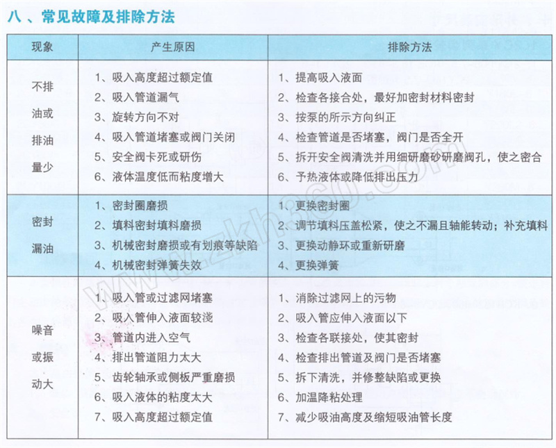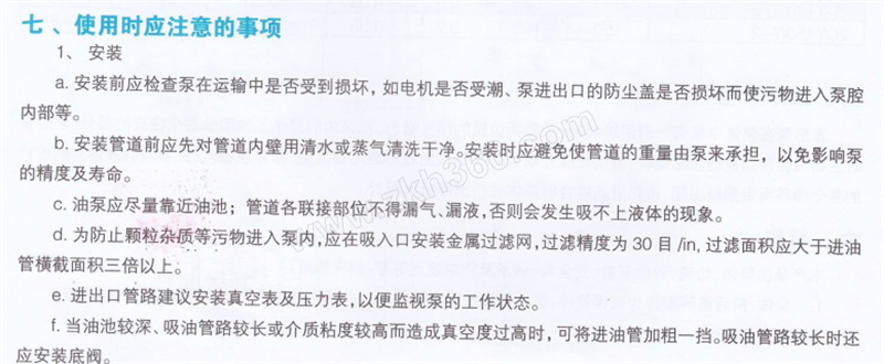 1、安装前务必去除进、出油口内的封口纸板,并向泵内注入适量被输送介质。 2、安装时严禁泵及管道内存留杂物。 3、建议在泵的进、出油口管路上分别安装真空表及压力表,用以 监控泵的工作状态。 4、检查电机转向是否正确。 5、严禁长时间超负荷运行。 6、严禁无液空转。 7、请勿随意调整安全阀,如确有必要,一定要用仪器调至规定压力。