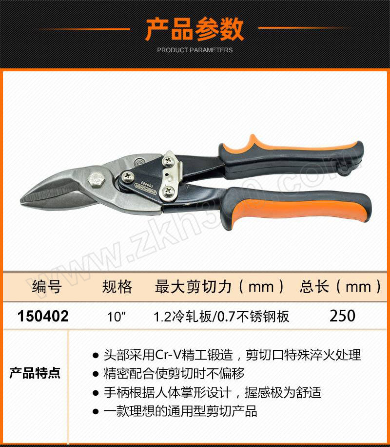 ·头部采用Cr-V精工锻造,剪切口特殊淬火处理,剪切更顺畅 ·精密配合使剪切时不偏移 ·max剪切能力:1.2mm冷轧板或0.7mm不锈钢板 ·手柄根据人体掌形设计,握感舒适