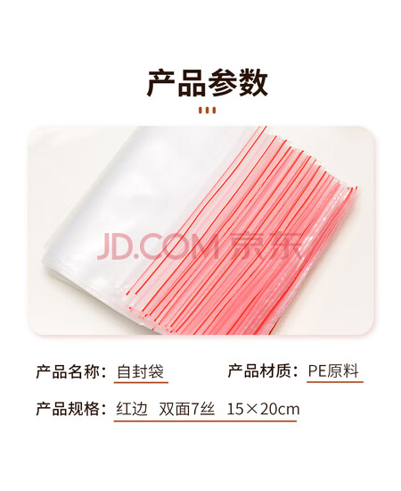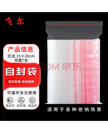 飞尔 自封袋 PE透明袋 食品保鲜袋 密封塑料袋 塑封分装收纳袋 防水防尘封口袋 红边15×20cm 双面7丝 100个